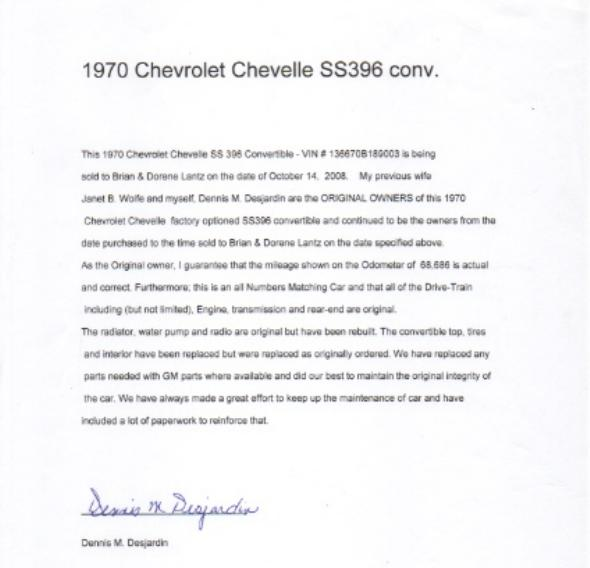 This 70 Chevelle SS I'm presenting and consigning today is a superb example of a very nice looking turnkey high quality show car. Documents are incredible which include Original >>> Build Sheet, Protect-O-Plate, Dealer Bill of Sale, Chevrolet Pre-Delivery Service Adjustment Check sheet, History of Original owner Janet R. Desjardin explaining why she bought this SS and a former Bill of sale from Janet’s Husband Dennis verifying how original the SS is which is signed. Factory Options Include >>> A51 Bucket Seats, B37 Floor Mats, B93 Door Edge Guards, C06 Convertible Power top, D55 Center Console, G80 Posi Rear Axle with the standard 3.31 ratio, L34 396 350 HP Motor, M40 Automatic Transmission, N33 Tilt Column, N40 Power Steering, U35 Clock, U63 AM Radio, ZL2 Cowl Induction and of course the Z25 SS 396 Package. Also this SS did come with the White Stripe Tires as it is clearly on the Build Sheet as you could request white stripe tires by simply asking the dealer when ordering the car. Car runs and starts fantastic and the current owner has won many awards with this car. The car has never had a frame off restoration and the undercarriage is very clean. Serious Buyers Only 905 951 3587 if you have any questions, leave message on my answer machine. Car is located in Chicago IL. Price: $82,000 or Best Offer. Thank You!