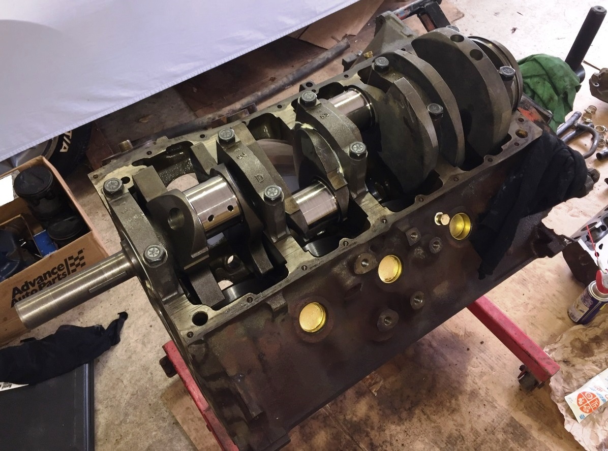 Chased all the threads in the block this morning. Then I installed the rear main seal, bearings and crank today. Oil clearance is .002, checked with the old Plastigage green. Nice, leisurely day in the garage.
