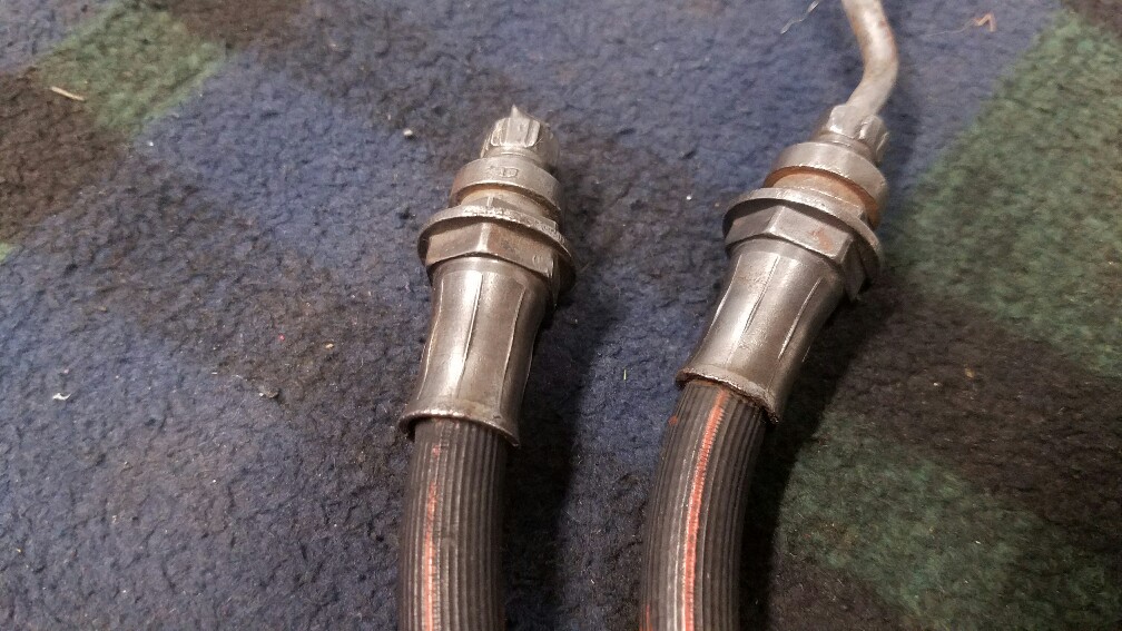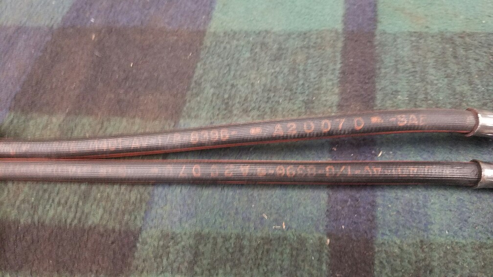 65 through 72 original single crimp Corvette front rubber brake lines. Original red stripe with stenciling. Very nice very hard to find. SOLD $250 PPff. THE X