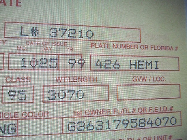 Pete, In 1999 it had a Florida plate that was 426 HEMI Thanks !