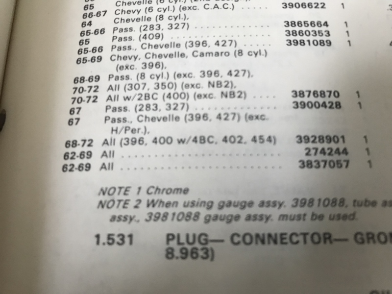 CONGRATS Jeff, heck of a deal there IMHO! That's what the book says, so I'm sure it'll work; if not, I'll take it back if unused. it says 65-70 and then 71-72 likely to differentiate between the change between 396 & 402, in name, due to bore out as we all know. Enjoy! Anthony |