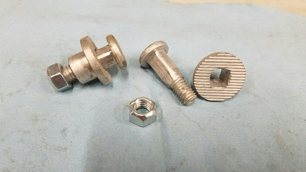 Convertible hinge mounting bolts with serrated bushings and lock nuts. Nice original pieces removed from a 69 pace car decades ago. Replated. $25