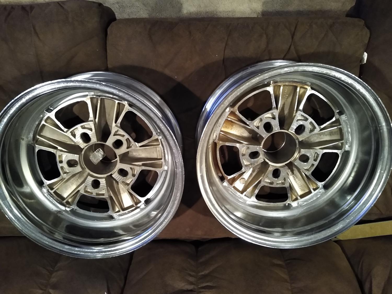 NOS pair of Cragars SS, 14 x 6 unilug with correct round spokes. 3.75 backspacing. Ones made today are 3-3/8 I believe. One wheel is 1985 and other is 1981 I think. Pre mid 80's ALL Cragar SS had the lug nut pocket sprayed gray. Kryon 1431 dull aluminum is exact match. You can fog in the 1985 wheel to match if you prefer.