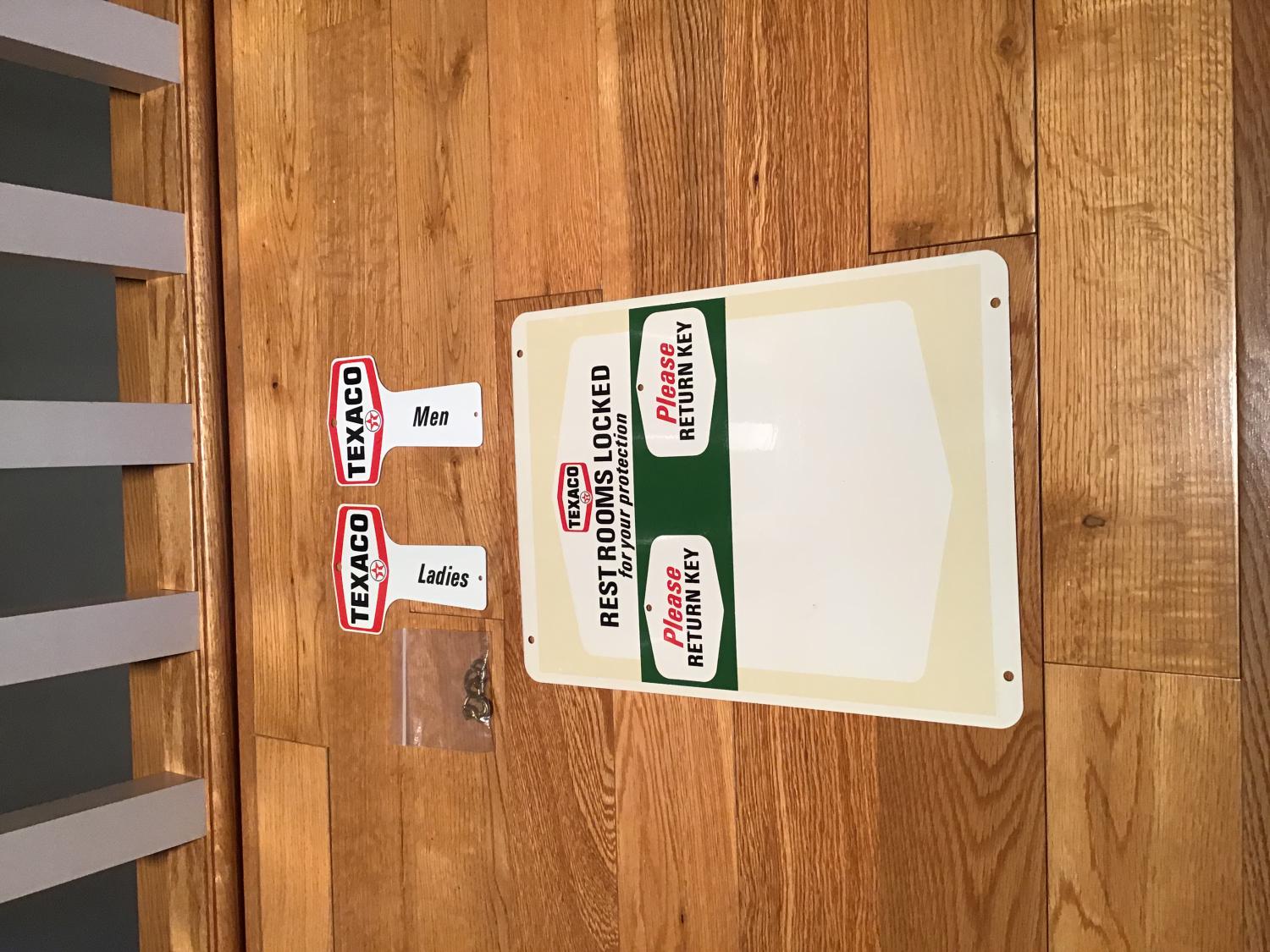 NOS Texaco restroom key fobs,rings and hanger board. These have never been mounted or used. Board is dated March of 1971? No major scratches or blems.The rings have never been crimped for key placement. Very nice pieces that would make a great addition to a collection. $300.00 plus shipping.