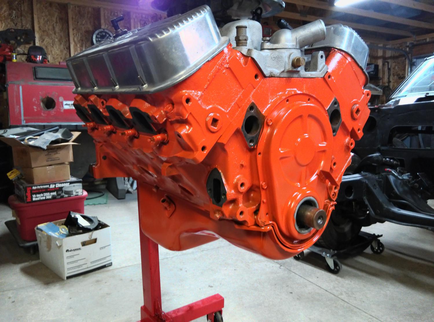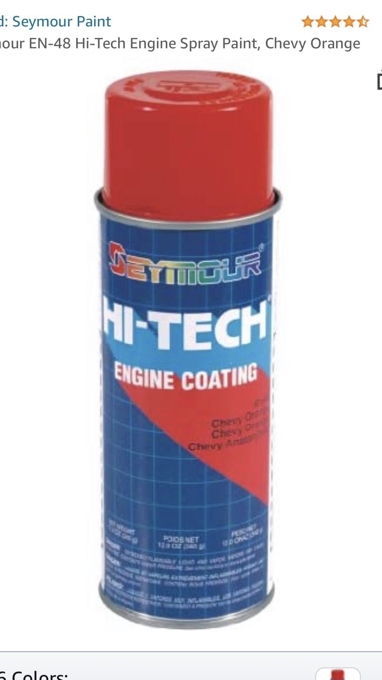 Seymour HI-TECH Engine coating EN-48 Chevy Orange. Jerry MacNeish told me about this paint. Take it from an expert. Online to buy on ebay to. I use this paint and will never use any other. Dries fast.