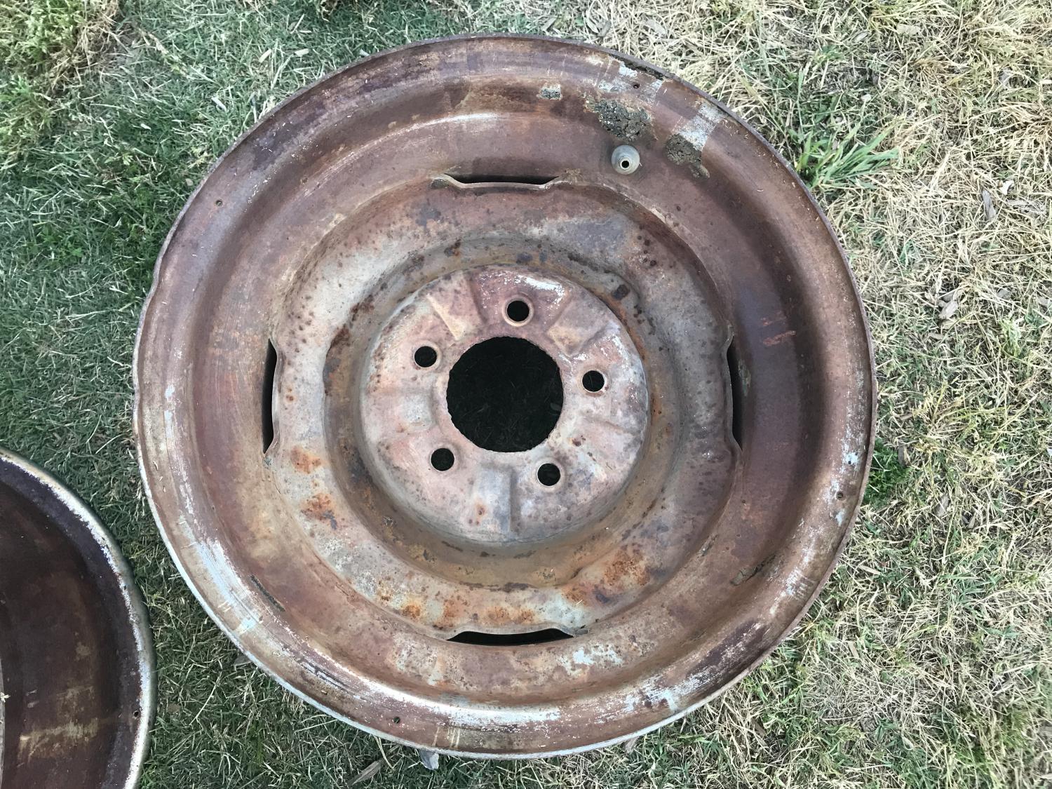 They're drilled for screws for slicks. Rusty but it's not fatal, could clean up, even be restored and rechromed I would imagine. They'll take a 10.25" dog dish cap. Lug holes OK. some curb nicks and dings on one lip as shown - repairable. Some tar by one valve stem. Overall condition as shown.