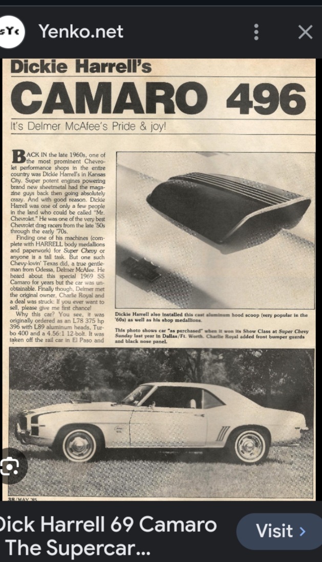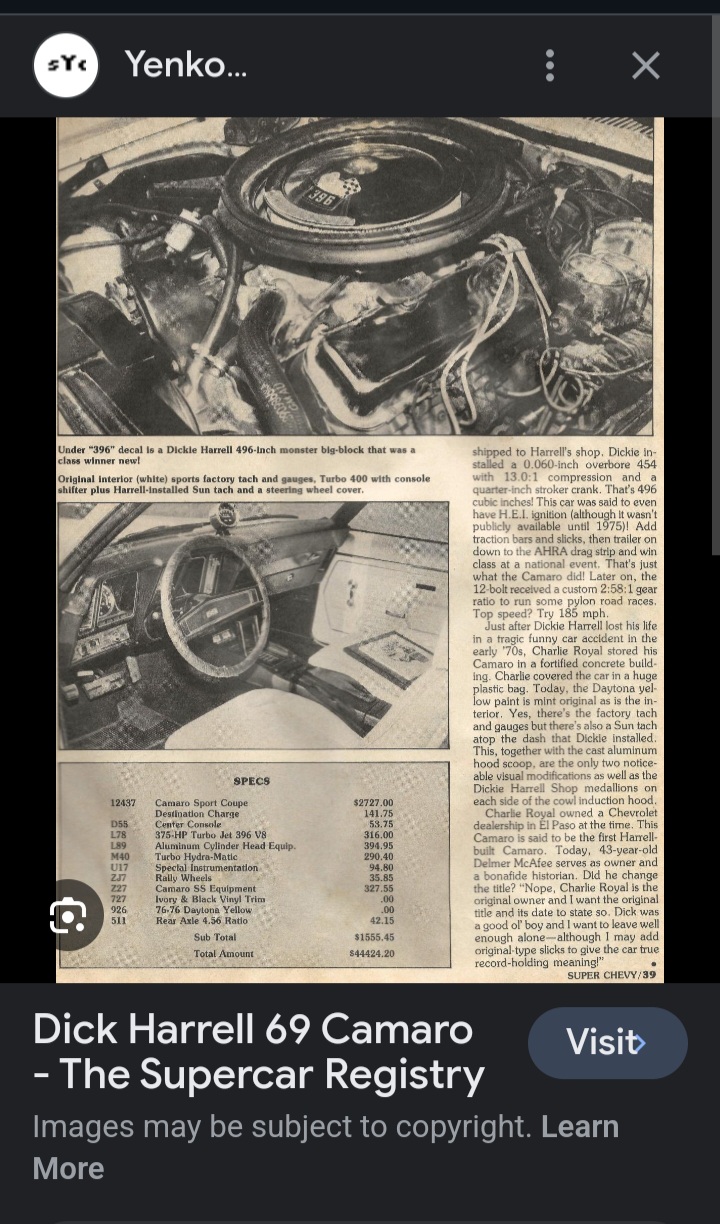 Hi everyone I used to see that car driving around El Paso a man named Charlie Royal bought it new with the original motor on the side and a spare motor he would take it to the drag here in El Paso Texas and race it had the original window sticker on the car a friend of mine named Mike lightburn had been trying to buy the car from Mr Royal for a long time finally he got Mr Royal to sell it and Delmar McAfee bought it through Mike