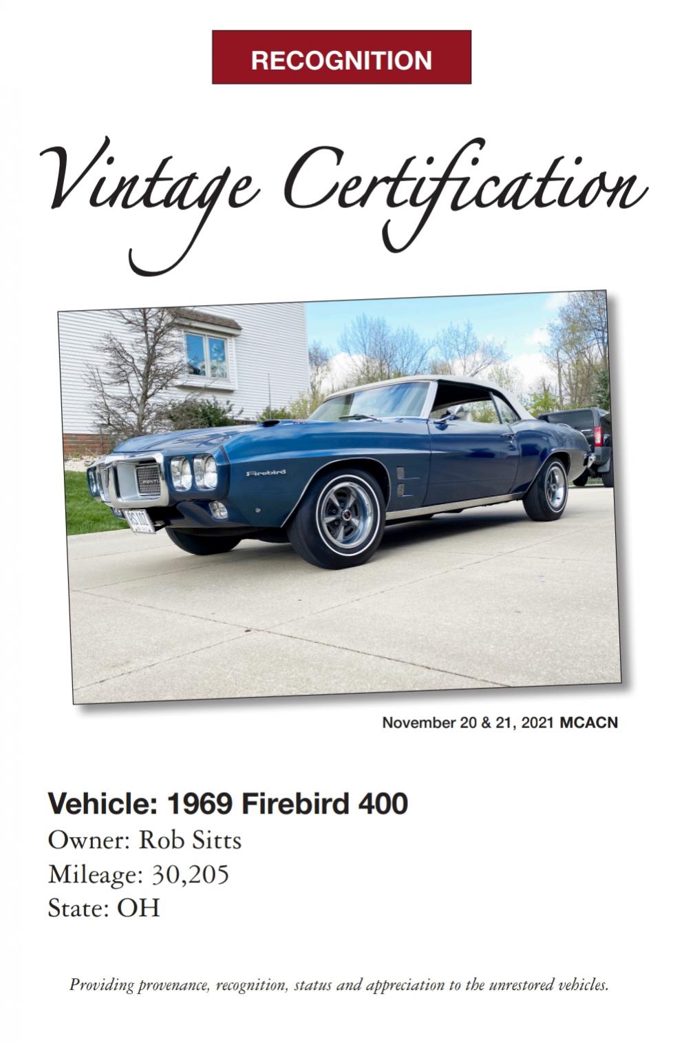 Vintage Certification™ is a judging program whose sole purpose is to recognize, provide status, provenance, and promote un-restored (survivor) vehicles. We believe it is the only program that focuses on documenting and benchmarking these cars. Our core certification team consists Brett Merryman, Paul Martin, Steve Minore, Chris White, Scott Tiemann, Frank Badalson, Warren Malkin, Marty Burke, Jason Billups, John Ballard, Jeff Cook, Steve Shauger and other marque specialists based on make and model. Each core team member possesses over 30 years experience as restorers, collectors, historians and judges in the hobby. Typically we spend 3hrs examining in detail every segment of your car including the underbody on a lift. To learn more about Vintage Certification visit our website at www.vintagecertification.com or the MCACN website at www.mcacn.com. This is the perfect venue to have your vehicle certified. You will be among and exclusive group of enthusiast who participate in this exciting event. We understand not every original car is 100% untouched, and we offer five levels of certification, based on the originality of the Vehicle. Vintage Certifications™ five divisions: Vintage Time Capsule - Vehicles that are 95+% unrestored in all reference areas Vintage Legend - Vehicles that are 85+% unrestored in all reference areas. Vintage Heritage - Vehicles that are 85+% unrestored in five reference areas. Vintage Legacy - Vehicles that are 85+% unrestored in four reference areas Vintage Reference - Vehicles that are 85+% unrestored in three reference area. Reference Areas: Certification consists of two areas of consideration, Originality and Preservation. Reference areas are as follows: • Engine Compartment Area • Exterior Body • Interior Body • Underbody • Trunk (except Corvette) Amazing list participants: 1967 Chevelle SS-L35 Bill Wente 12k miles Awarded Time Capsule 1967 Chevelle SS-L35 Keith Kiser Awarded Legacy 1969 Chevelle SS L78- Kevin DeWitte 35k miles Awarded Legend 1970 Chevelle L34- Phil Wojnarowski 2,400 miles Awarded Legend 1970 Chevelle L34 Michael Maresca 17k miles Awarded Legend 1967 Camaro Z28- Chris Piscitello 13k miles Awarded Legend 1969 Camaro L78- Guy Youngdell 12k miles Awarded Legend 1967 Corvette L79- Mike Wheatley 65kmiles Awarded Legend 1970 Superbird 440- Doug & Chris Hammond 9k miles Awarded Legacy 1969 Firebird Conv RAIII- Rob Sitts 30k miles Awarded Legend 1971 Trans Am- Tim Schuetz 18k miles Awarded Legacy 1969 Torino 428 SCJ Wayne Schmeeckle 1.1K miles Awarded Legend 1957 Chevrolet FI Charley Lillard Awarded Legend Heritage Display (non judged unrestored cars) 1968 Camaro Z28 1967 Corvette 427-400 Convertible 2021 Vintage Certification registration is full and now accepting applications for 2022. If you are interested and have questions visit our website at: vintagecertification.com Visit the site for more info such as, rules and guidelines and downloadable application. Email [email protected] or call 63one-514-9765