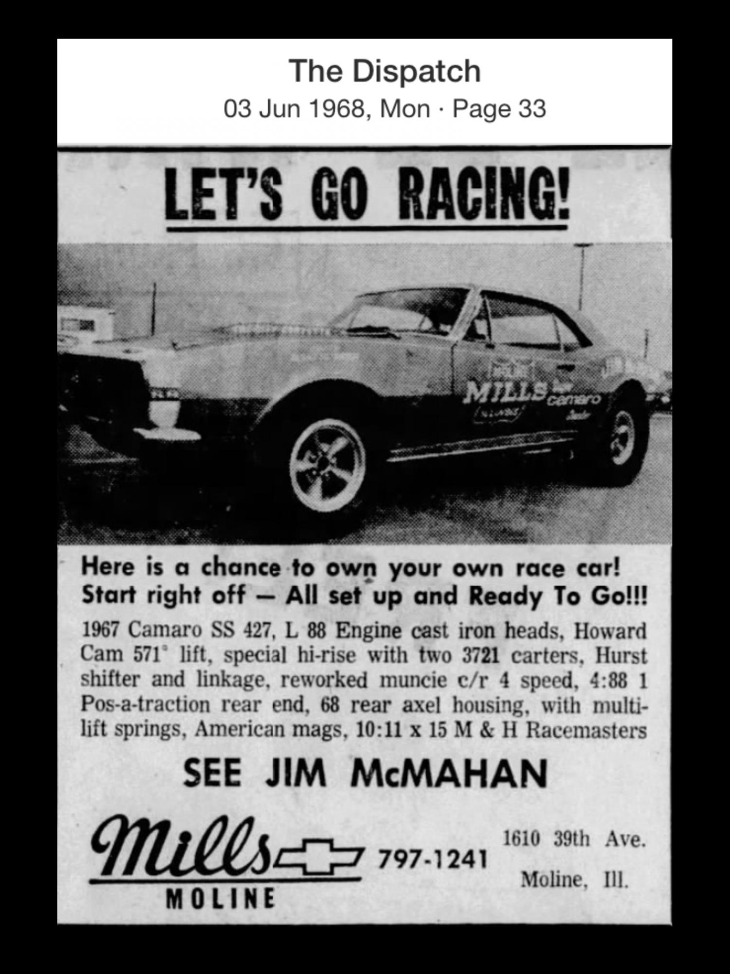 Going through my old system, here’s one I meant to post a year or few back. There’s a few old threads here w/ Mills Chevrolet Moline and this one had more recent action so seemed best to land this 06/68 Newspaper Ad below w/ stout sounding L88 ‘67 Camaro. Being Mills was a Network Dealer, was this a Yenko Camaro also if so, Harrell built? ![]() There’s a few here w/ Mills cars and connections, anyone know anything/ever heard of this car/existing today/another to look for? ![]() ~ Pete .