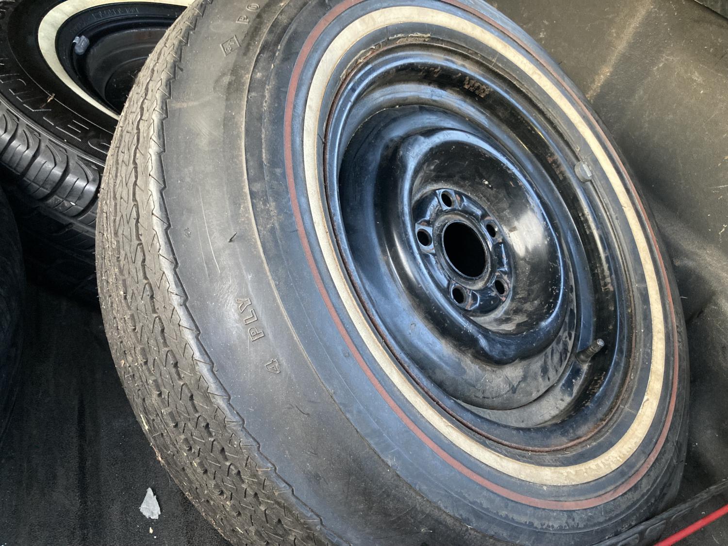 I picked up a set of take off wheels/tires from a nice ‘66 Thunderbird and was delighted to find a never on the ground optional Goodyear 8.15-15 whitewall/redline spare tire. I found a picture of this on a restored car to show what it looked like new.