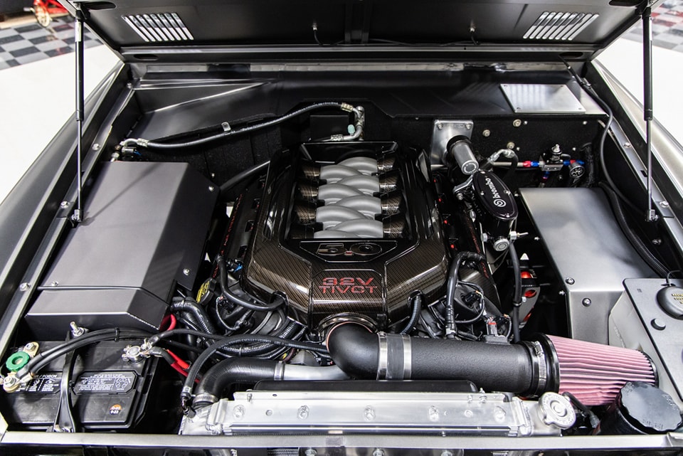 The engine compartment is highly detailed throughout with many new parts. The underside of the hood was refinished in Matte Gray and held with two ABco hood gas struts. The firewall was refinished in Matte black textured paint. The inner fenders and radiator was refinished in Matte Gray. It's equipped with a Ford factory engine harness. The main wiring is covered by a painted removable cover. The Bronco is powered by a Gen 1 Coyote crate engine that is factory rated with 420hp. The engine intake and valve covers were dipped in carbon fiber which looks amazing. Some engine compartment custom features include a K&N air filter, Edelbrock fuel pressure regulator, Marshall fuel pressure gauge, Brembo hydro boost master cylinder, aluminum radiator and power cutoff knob for battery. It's equipped with a PSC power steering reservoir. The engine breathes through ceramic coated exhaust system with Magnaflow muffler that sounds awesome. The engine is coupled to a new 4R70W 4-speed automatic transmission that shifts smoothly. The power is transferred through a General driveshaft with 1310 joints and a custom built Dynatrac Dana 60/44 based solid axle with 4.09 gears. It's equipped with a purpose Atlas II transfer case with optional ARB front and rear locking differentials with air compressor.