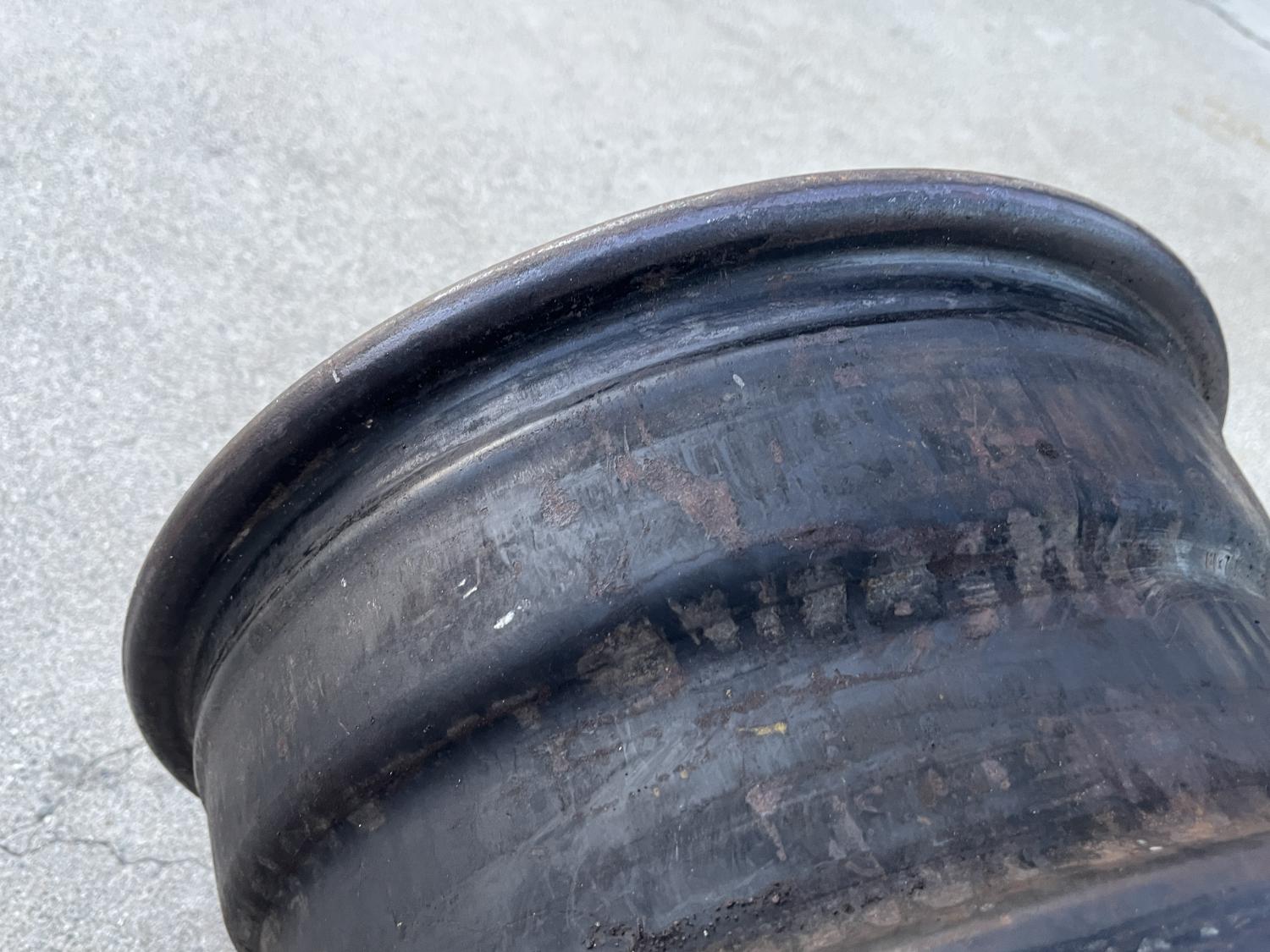 A very hard to find K18 K-1-8 IF coded rim for the 1969 model year SS / COPO cars - IF 14X7 Camaro steel wheel. This was the first year for 14X7 plain wheels standard dogdish type steel rims on our factory disc optioned supercars. This one is nicely dated for early 1969 calendar year production - K18 "something" 17 - The month numeral stamp was presumably under the valve stem hole punch, and therefore not readable - and I suppose, you could call it for any of the late 1968 months of production; August September, October November or December - the 17th day, 1969 for 1969 69 Camaro models like SS396, SS350, and some 427 COPO cars too - maybe even some HiPo dealer cars too - Nova cars as well, I believe. This wheel is in very original shape and is, in my opinion, a great candidate for a light restoration; no fatal flaws, but I try to disclose everything, see the last photos. It has, I believe, been repainted and has a heavy coat of black paint on its face, I've pictured a couple close ups. It was also marked years ago it seems as "drum" which we all know, is incorrect; this is a disc brake wheel. It has the correct dimples by the valve stem hole too, of course. This is a California / CA wheel that has never been rusted / pitted or restored / filled or any major work done to it, look at those beads; they are perfect. This is the wheel you want for your significant car. I've attached many photos to give the whole story as to its condition. IFs are not quite unicorns, but they are certainly uncommon anymore, especially the EARLY K18 ones - and in this condition; this is a perfect opportunity to return a nice factory wheel to the trunk of that significant 1969 Camaro, Nova too. Even the Yenko / Gibb / Harrell and other tuner cars with steel dog dish rims. And of course, the unconverted cars too. There are several theories WRT IF coded wheels, that they were Firebird or Los Angeles / LA / Van Nuys builds... but they are physically identical to XT rims, and this is a KH / K-H / Kelsey Hayes specimen, not an NT / Norris Technologies unit. Gran Prix cars too maybe? Look at the photos again, this rim is nice. Cross posted on FB. Thanks for looking, as always Anthony |
