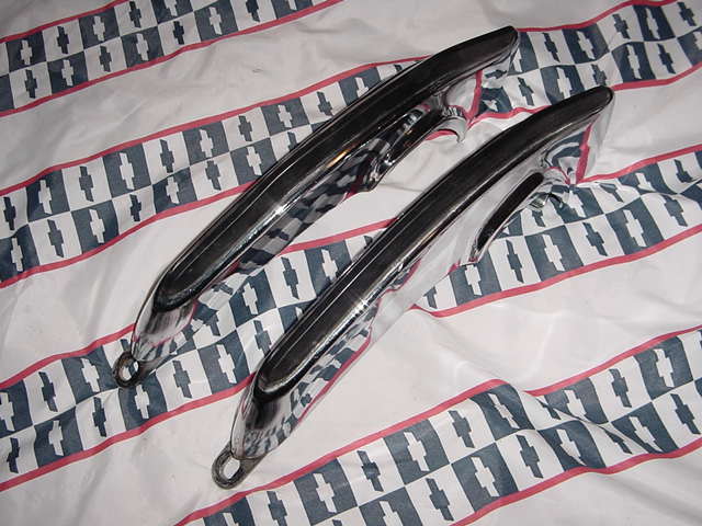 I'm gonna list these on ebay tomorrow unless someone here has interest in them... they are used, but were NOS a few years ago. They fit an original bumper correctly, unlike the repros. Very nice shape, one has a couple mild scratches on the inside that look worse in pics than in reality. Rubber strips are originals and in nice shape. comes complete with bumper clip hooks and bolts too.