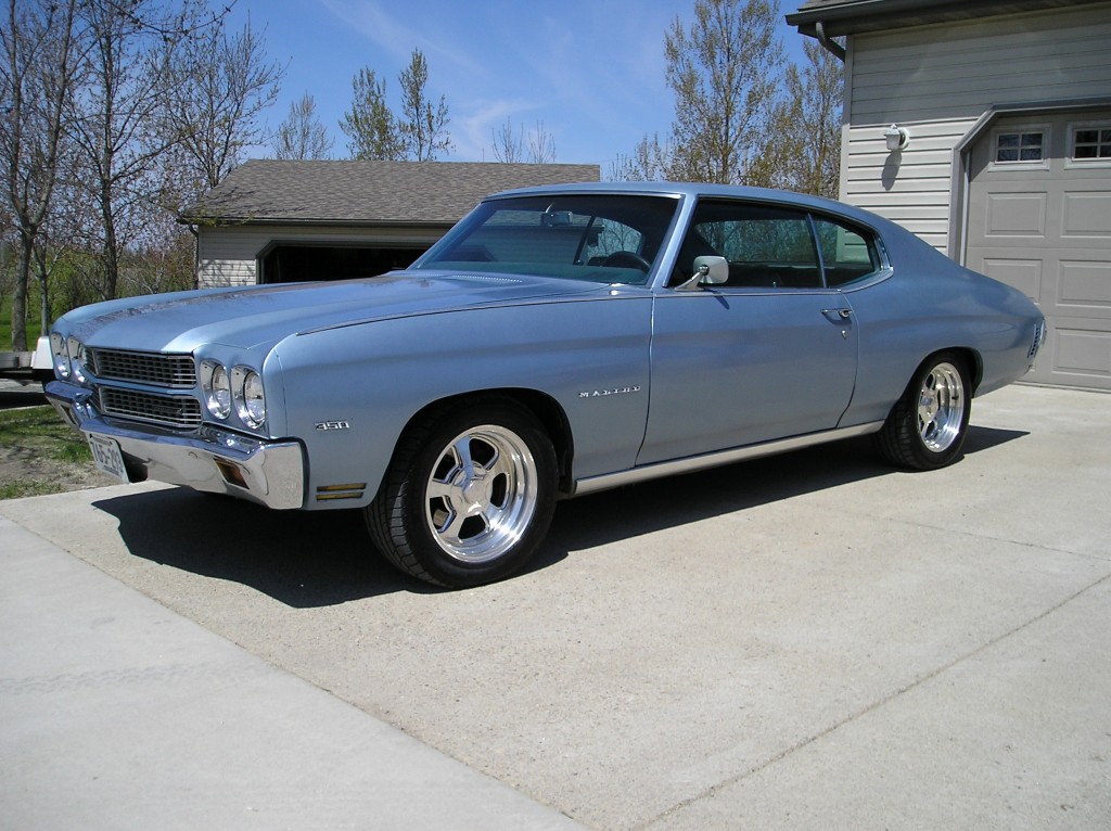 I couldn't find an introduction thread, just wanted to say Hi. You all have a great forum here! I don't know how much I'll be able to contribute given the expertise around here, but I hopefully won't be much of a bother either. I own a 70 Chevelle Malibu I purchased from the original owners in Oceanside California in 2006. I bought it while still in Iraq and the owners hung onto it for a month and even picked me up at the airport after a one way flight with my wife. Drove it home to ND and have been driving it ever since. The wheels are the only major departure from stock. I'm most excited to peel that Maaco astro blue off and start over (its going to need some work, notice the fender emblem), though I plan on painting it Lemans blue instead of the factory medium blue. Anyone know where to find blue or white rivar cloth? Thanks for keeping America beautiful!