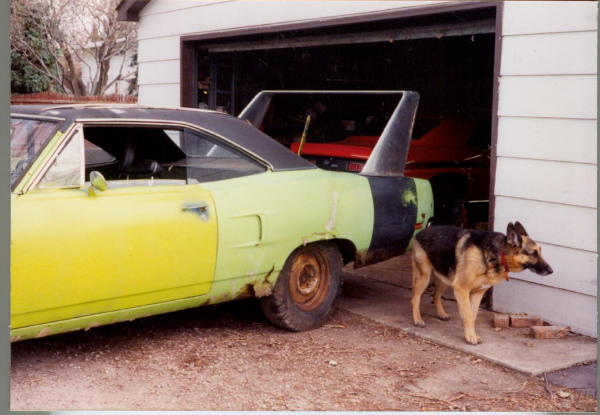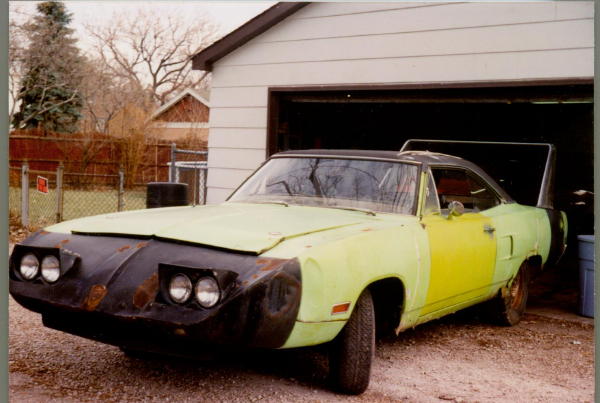Dans right I had a green wing car back around 1986. I was at a party and heard someone talking how there was a Superbird sitting unincorrporated Melrose Park in a guys backyard and had been there for years. That was only five minutes away from wher I lived. The next morning I got up early and went looking for this Superbird, I drove around for hours and couldnt find it. I drove around one last time and finally seen a couple of 4X8 sheets of plywood laying up against a car I got out and there it was. It was pretty disappointing no doors, no wing, intake and carb missing. The car was pretty rotted from sitting there so long.