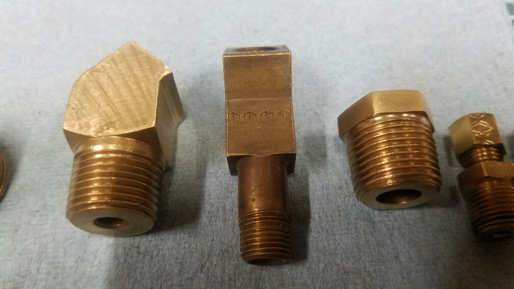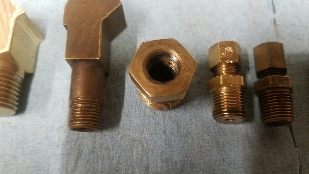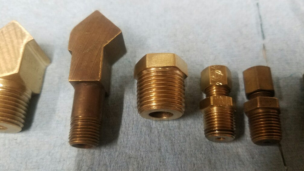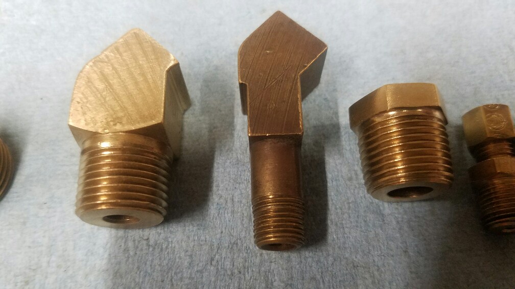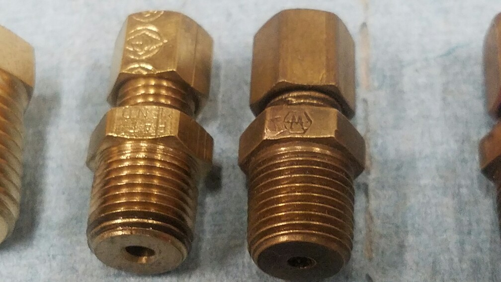 2 original 4 bolt main big block weather head stamped brass oil line to block fittings. Not being reproduce with the original weather head stamping or original concentric machining marks on surface. $40 each PP FF