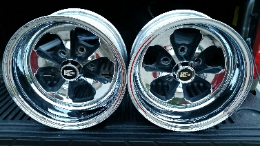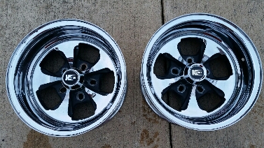 1 pair of deep dish 14x7 unilug Keystone Wheels. These are in nice shape, chrome is good but not perfect, no curb rash and not bent. Center caps are newer. If I was keeping them I maybe would repaint the black in the wheel. There are light wear marks from a lug wrench in the black section but they look very presentable.