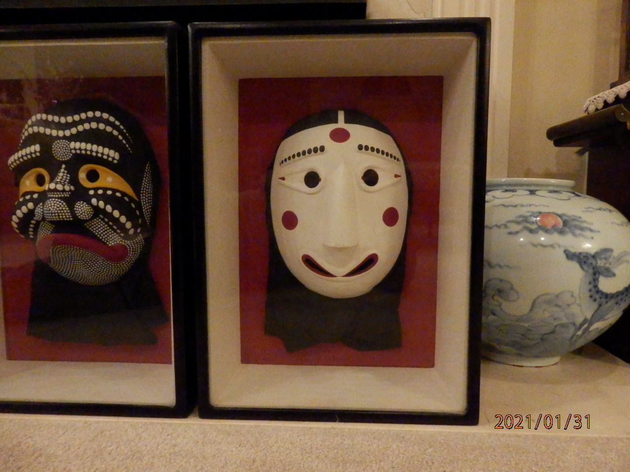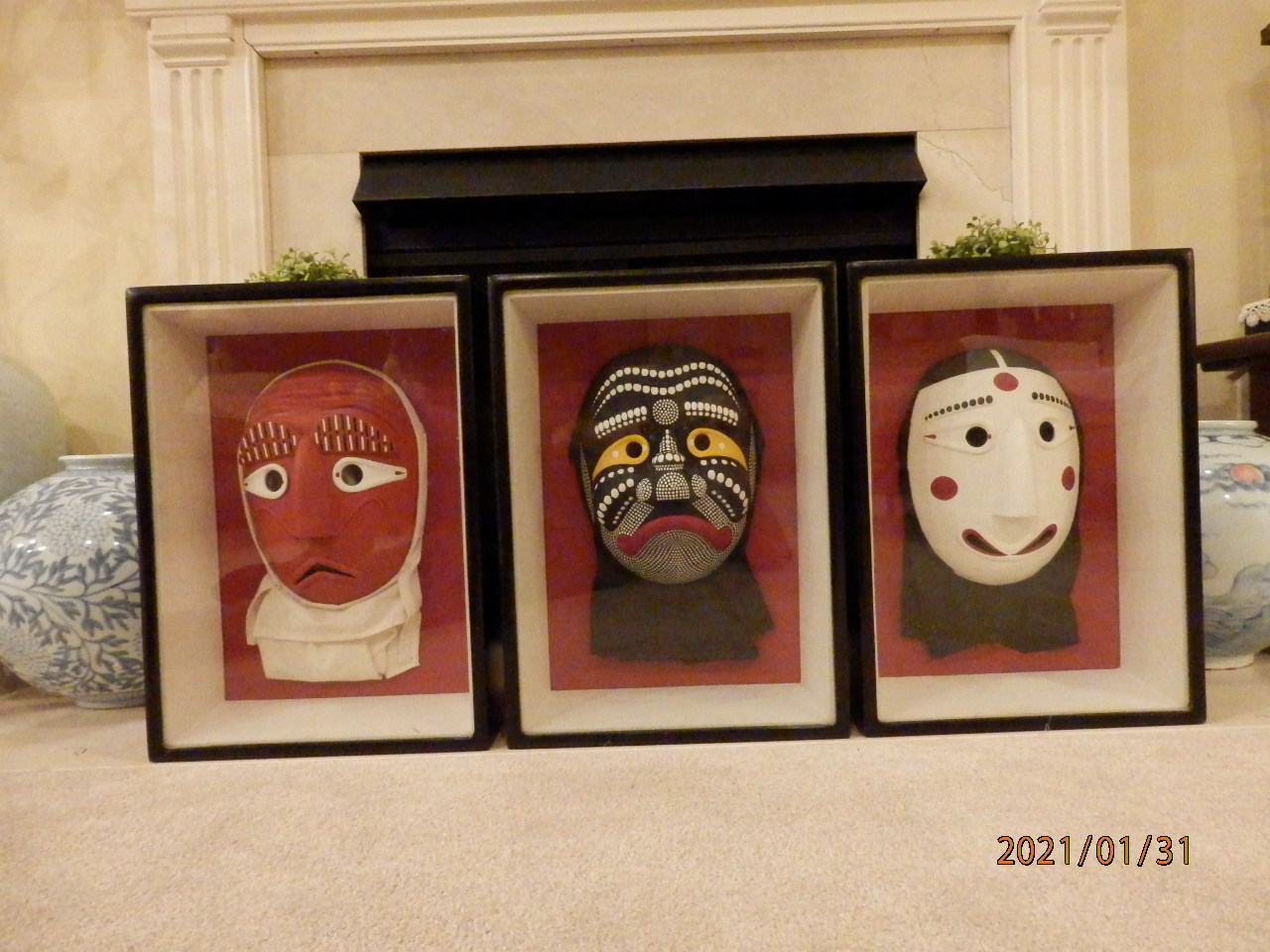 These are Vintage 1970's Korean Face Masks that my girlfriend brought to the US in 1975, she had them professionally mounted in a recessed frame. I had these on display in my home until the grandson was 3 yrs old, he was afraid of them every time he would come visit. They have been stored away for safe keeping, but it is time to let them go. They measure 18.25" H x 13.25" W x 4.5" deep.