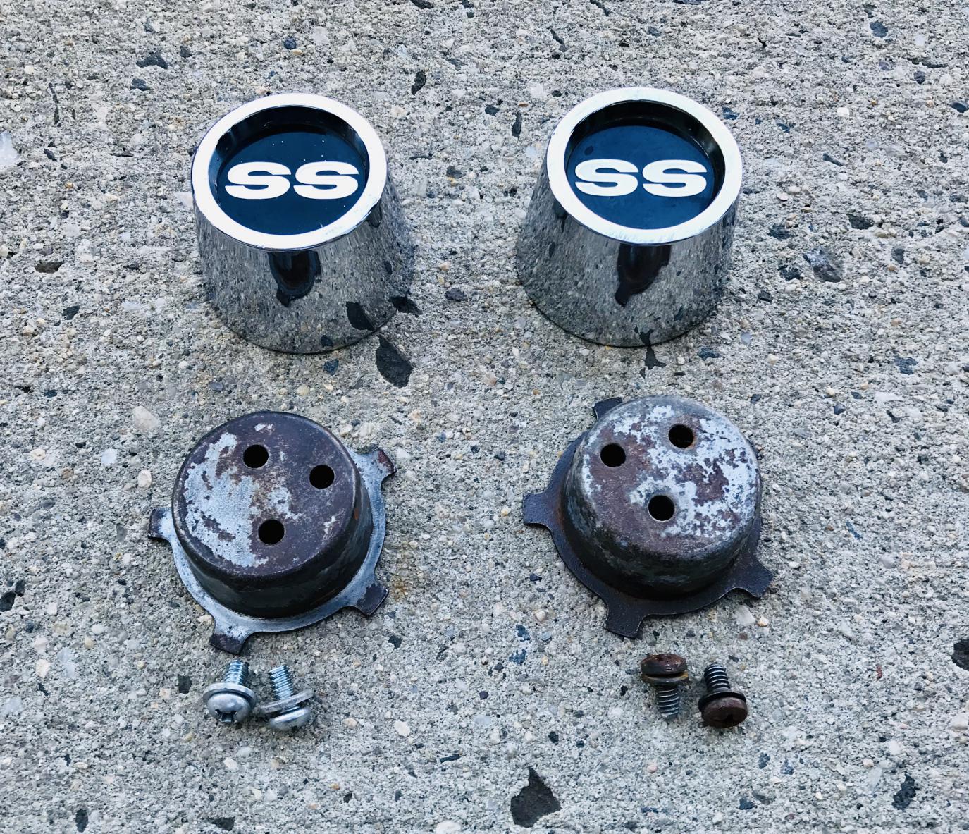 I have a pair of original assembly line deep top center caps with retainers & screws. GM part # 3956770, removed from a pair of 1969 YA wheels. They are not perfect but the chrome still shines nicely and the emblems have good color. These are great caps to restore or use them as-is on a survivor car. (SOLD)