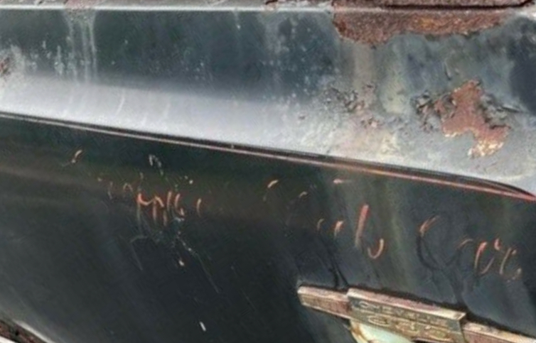 Interesting wagon - black on red with a 6-cylinder and factory air. I can make out some words faintly painted on the driver's side rear quarter - can anyone read them?