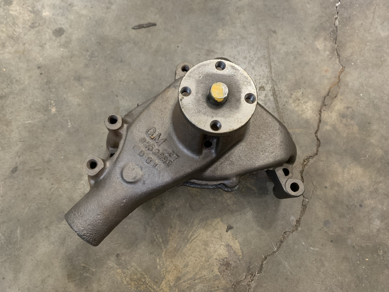 GM 3968692 water pump. Hard to read the date so you make the call. To me it looks like B 3 1 but maybe a 9.?. Maybe. Either way $125 plus shipping.
