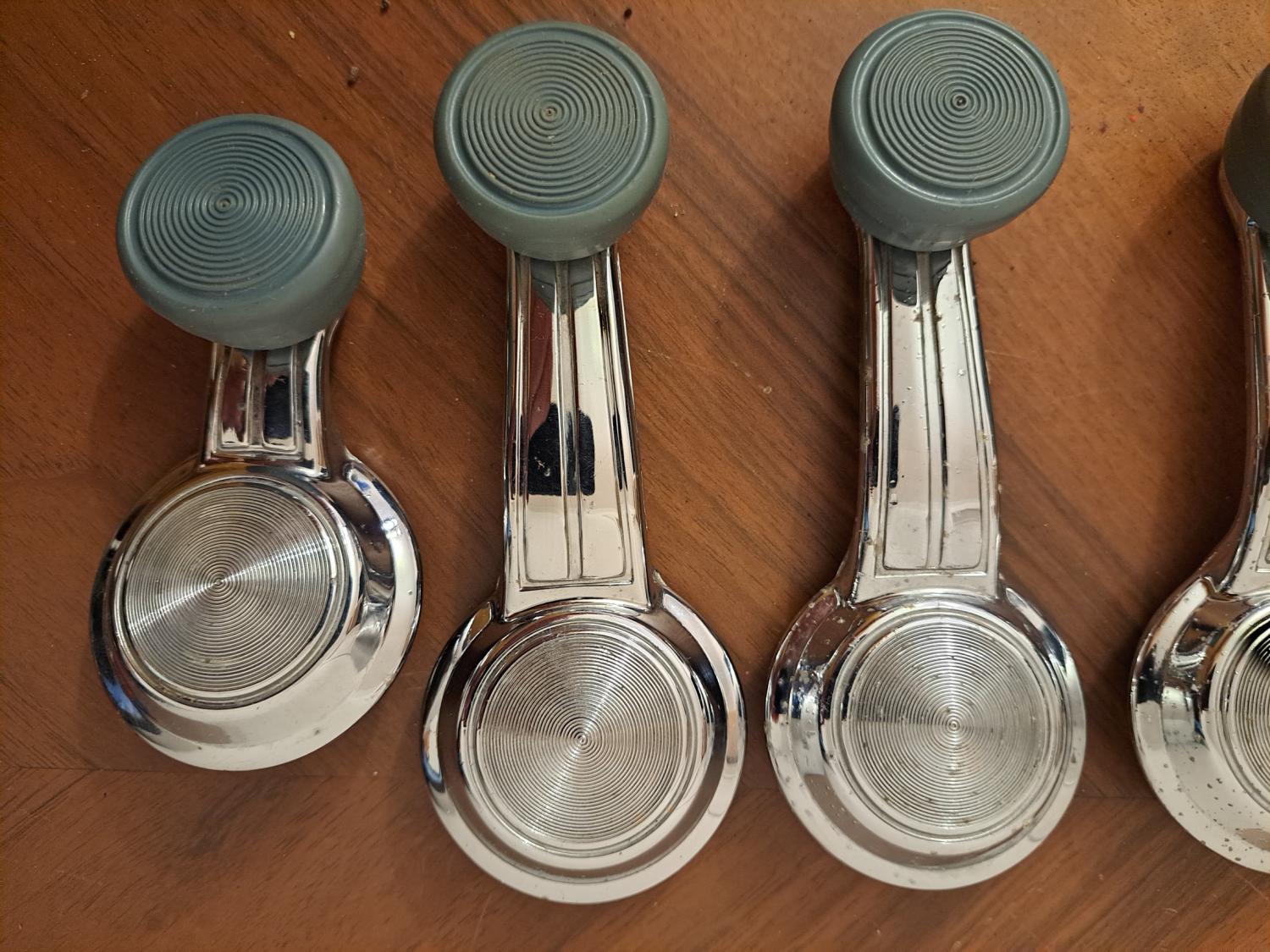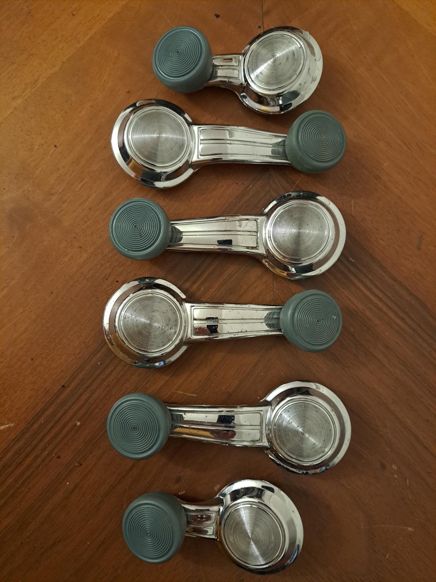 1. Complete set of six window cranks. I believe the color is turquoise but it may be blue. The two colors are very similar. Any color other than clear or black is very tough to find. The part numbers are 9715289 for the vent cranks and 9715191 for the window cranks. The chrome has some pitting as shown in the pictures. One knob has some play. The others are have very little play which is normal for this style window cranks. All cranks have the clips.