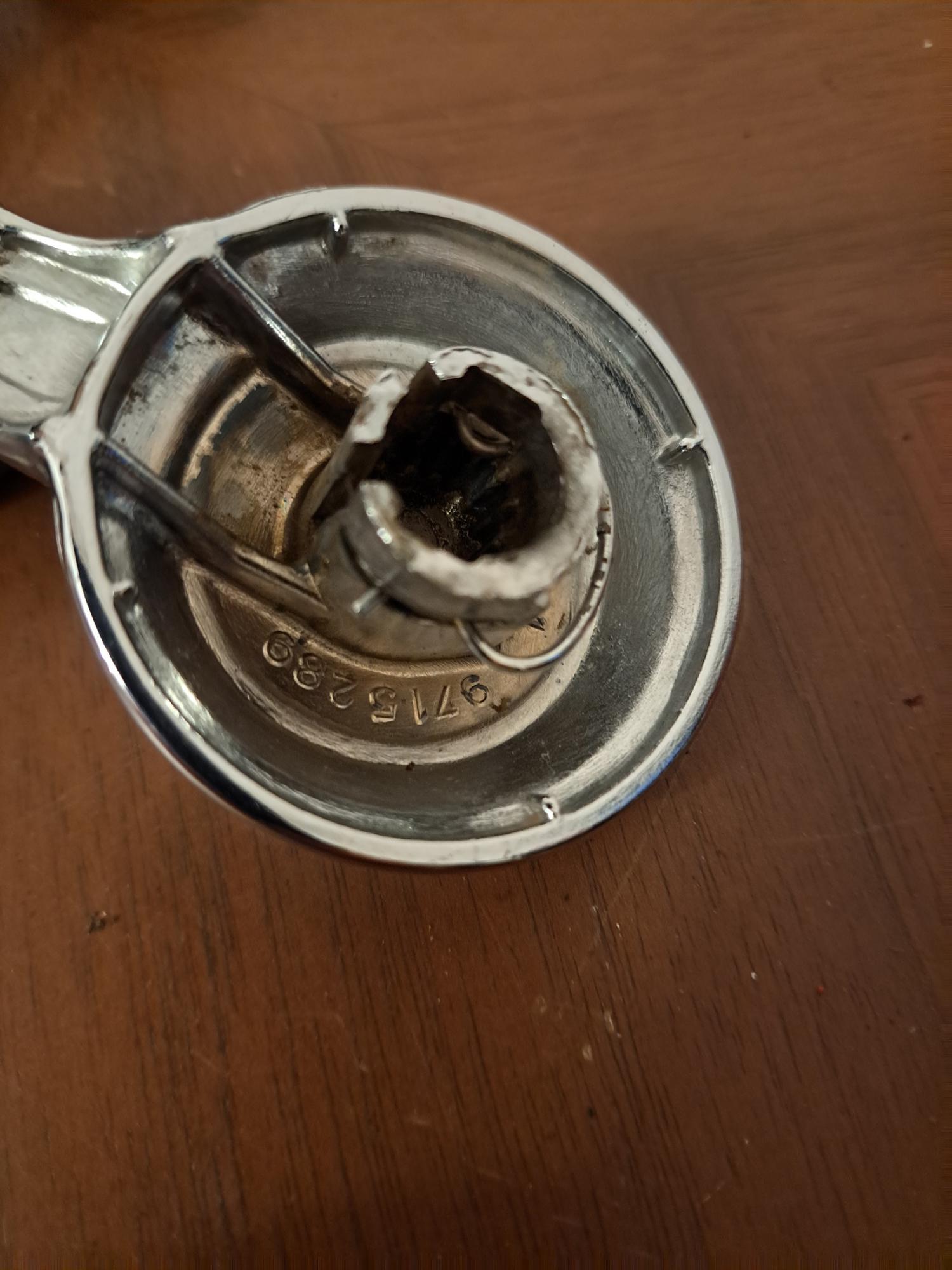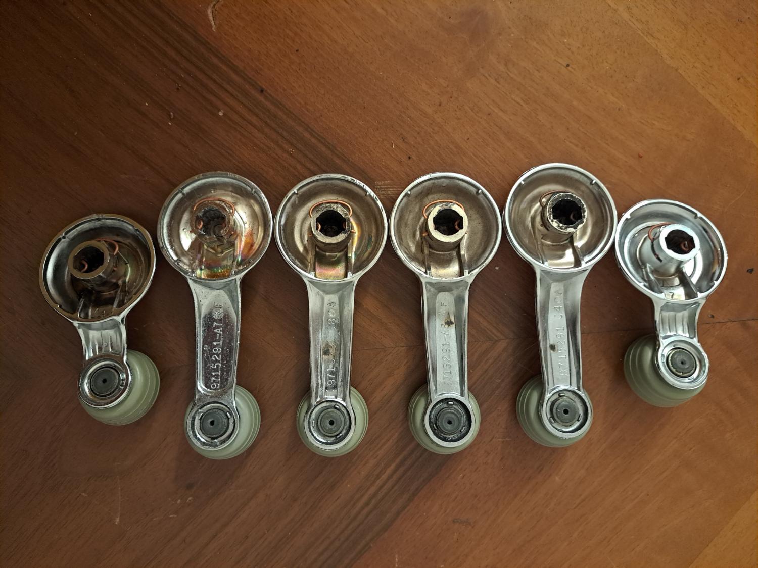 2. Complete set of six window cranks. These are grey which is a rare color. Any color other than clear or black is very tough to find. The part number is 9715191 for the window cranks. The chrome on one has some pitting as shown in the pictures. The others have minor wear. Two knobs have some play. The others are have very little play which is normal for this style window cranks. All cranks have the clips. SOLD