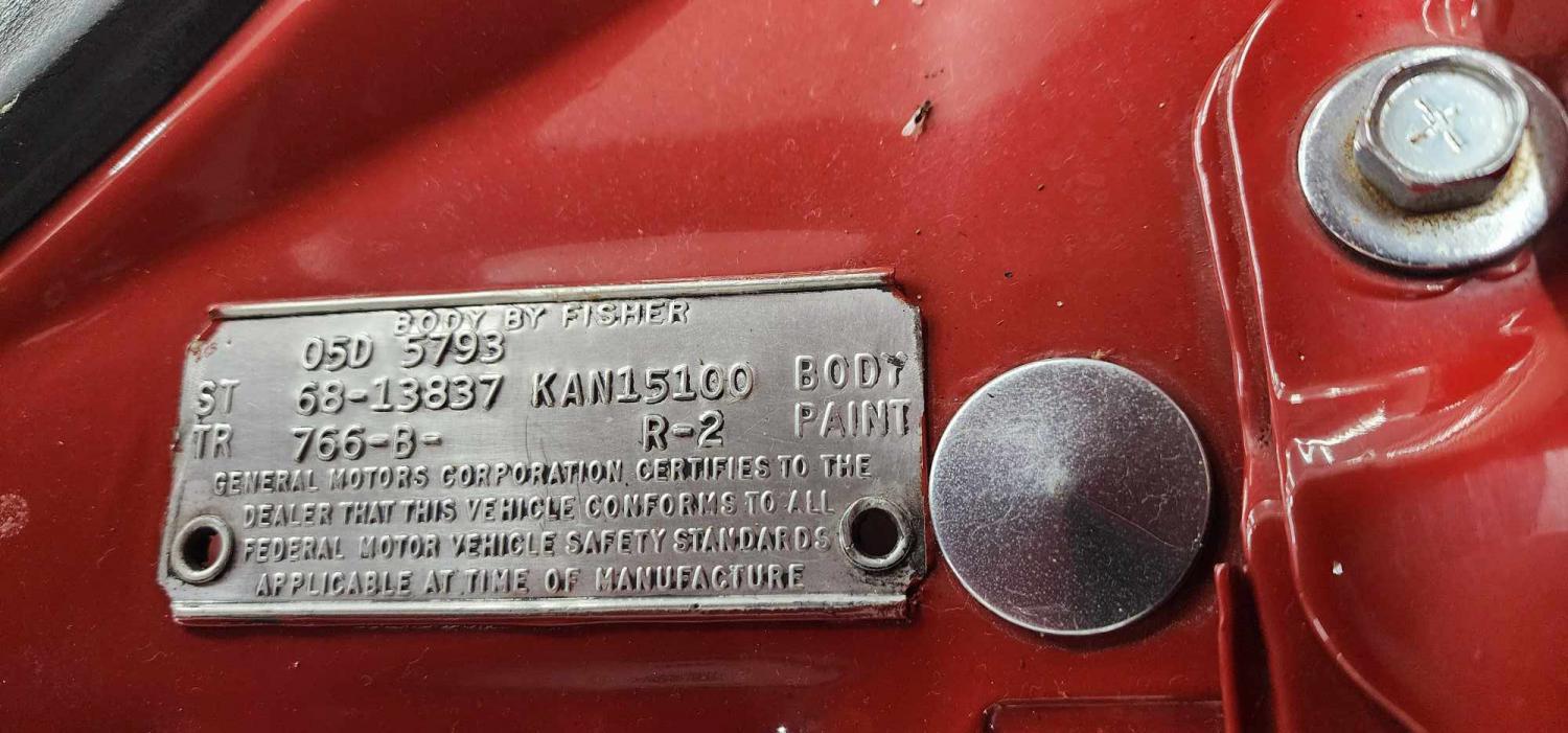 Just like a '68 Camaro, John. Not much there for info, built 4th week of May at the Kansas plant with Black bucket seat interior and Red with Black vinyl top. As Mark said, the 138 body style was the SS only designation, which would have come with a 396 engine. No way to tell which one.