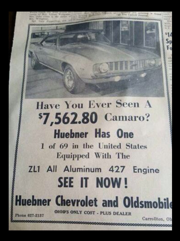 One owner 1969 X11 COPO Camaro sold new from Huebner Chevrolet in Carrollton Ohio. Cortez Silver with Black standard interior. Full documentation to include the following: