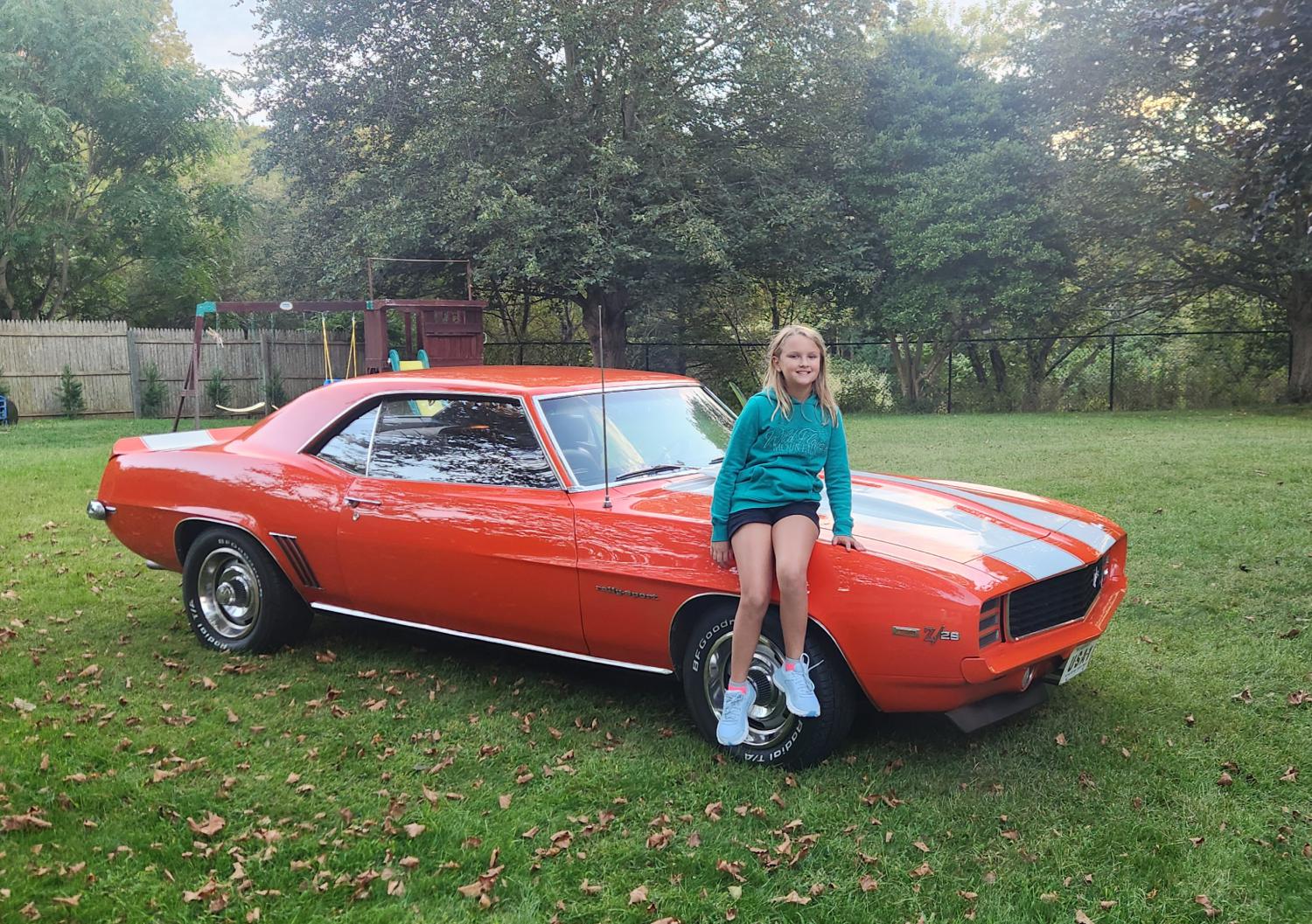 Our youngest grandchild Mason (18months) who loves my orange 69 RS/Z28. He is with us M-F 7:30 -4:00. He demands we see his orange car. He is very active so taking the picture was an adventure. He is a piece of work who keeps us on our toes, but very blessed. The second pic is his sister Hanna (10), heading to a cruisenight date.