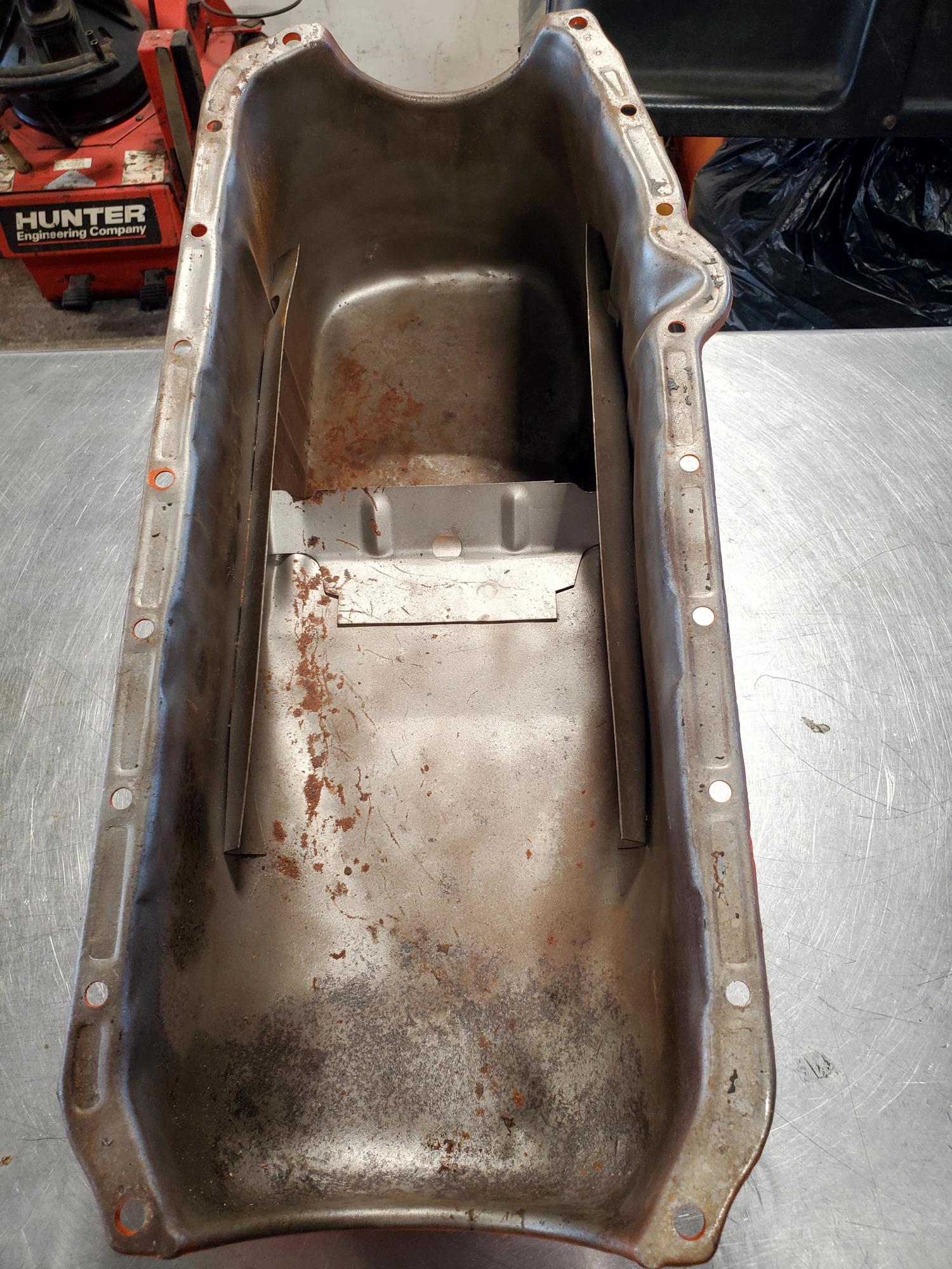 Super clean pan with 2.25" measurement to center of timing cover front flange on pan. (Look closely at 1/8" hashmarks on tape measure)