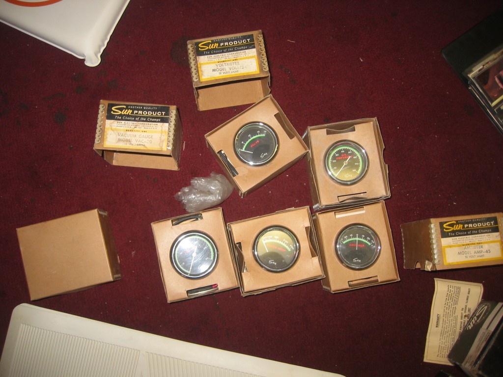 pair of SW oil pres and volts gauge in original chrome panel 150.00 NOS Greenline gauges in boxes 800.00 R.A.C gauges in woodgrain panel 100.00 3 SUN Gauges in chrome cups on a panel 250.00 Pair of 15x3 astro wheels with original skinnies mint 600.00 Pair of M/T wheels with caps GM pattern 250.00 267-246-6903