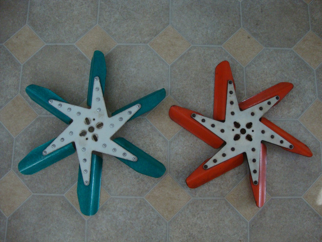 Orange fan is 17" in diameter. Green fan is 18-1/2" in diameter. Both fans have no cracks or damage anywhere. They just needs a quick cleaning up. $100 each shipped and insured to your door. -Matt