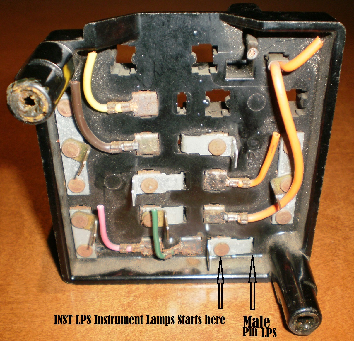 I glued the 2 pieces back together and found a small piece of plastic that I had from a Pertronix kit (Used for spacing the magnet) Lucky I kept this spacer all these years. I shaped it and cut it like the original and the red paint is my wife's Nail polish and green paint I had in the garage. The glue I used is called &quot;The LAST GLUE&quot; I have repaired a lot of plastics with this stuff including dash parts, it works great. [img]<<GRAEMLIN_URL>>/biggthumpup.gif[/img]