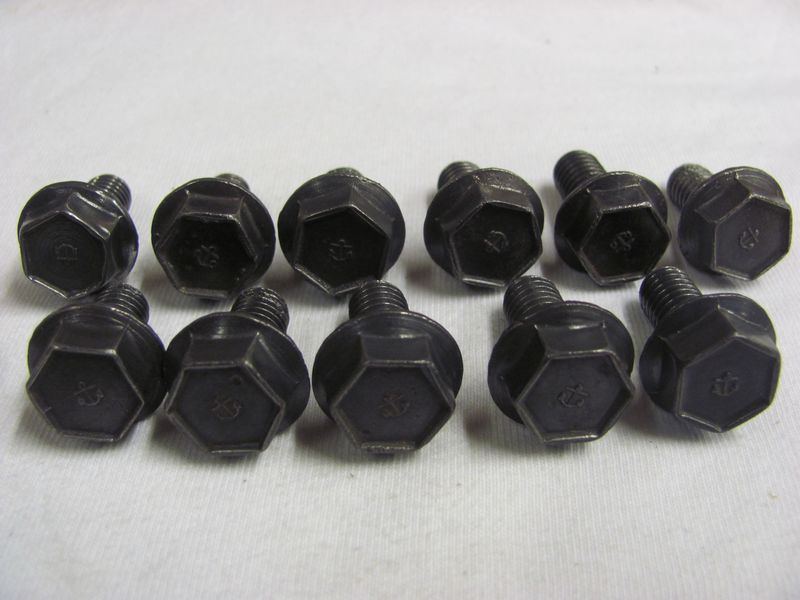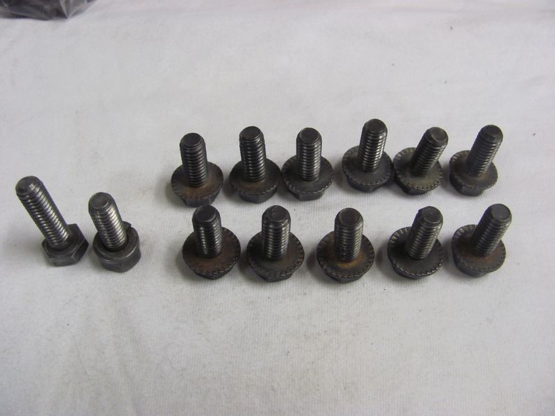 3 sets of 12 bolt cover and rubber brake hose mounting hardware for Camaros, Chevelles, Novas and other GM cars. The cover bolts have the serrated locking teeth on the undersides of the heads (repros don't) and the hose bracket to rear bolt has a captured lock washer