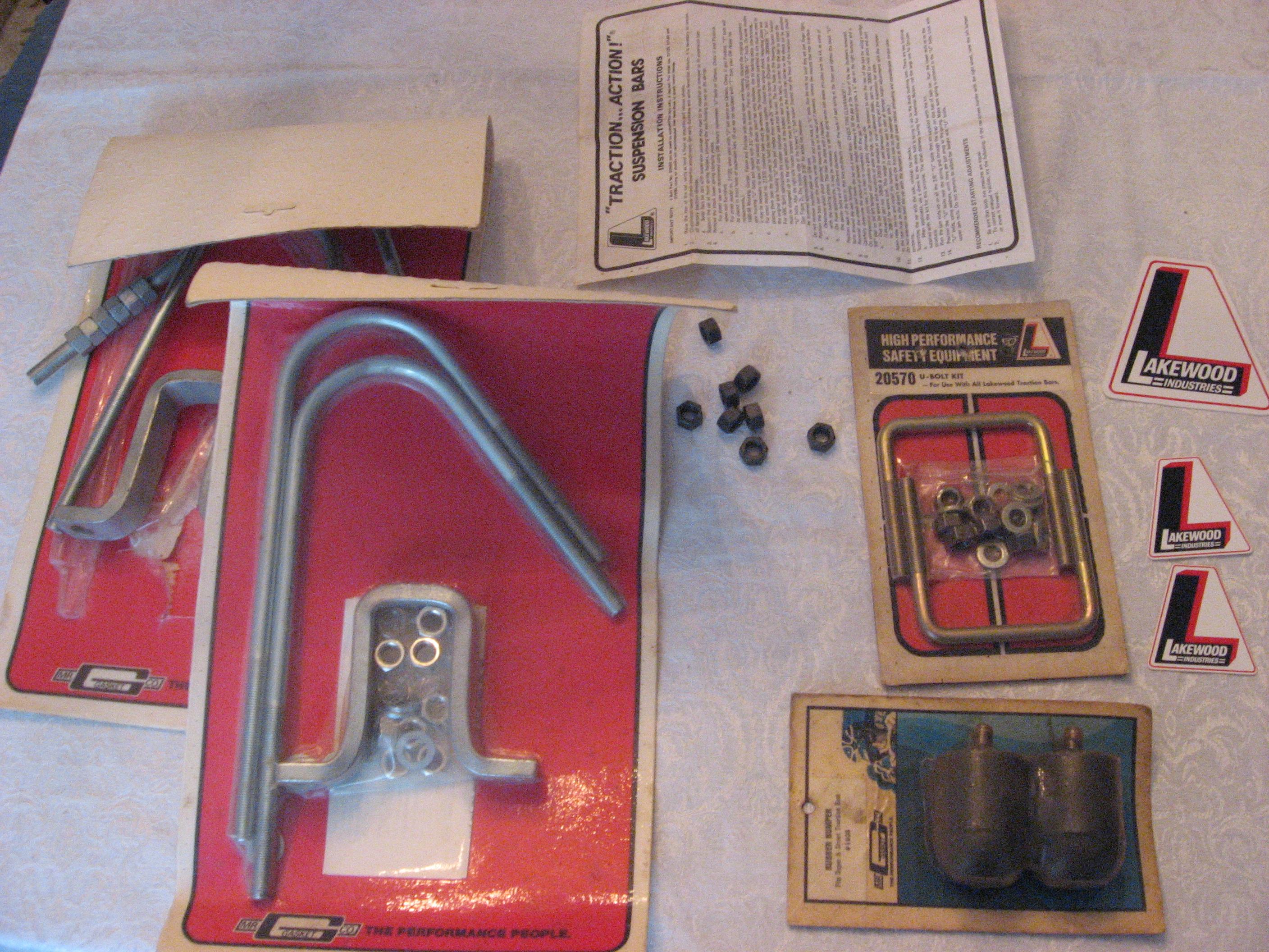 -Early 70's Mr Gasket blunt nose rubber snubbers..same exact style Lakewood used.Ones from Lakewood today are incorrect triangular shaped. -1970's Lakewood 20570 U-bolts in correct gold finish and black phosphate nuts -3 early pre 70's Lakewood decals <span style="font-weight: bold">w/o the R registration symbol</span>..2 for the bars and one for your trunk/window -1970's Packaging Lakewood J-bolts-one package was opened. -8 extra black phosphate nuts -Original Lakewood instructions on installing and setting up the bars Buy all this stuff from Summit = $145 J-bolt $50 each, u-bolts $26 and snubbers = 16.00 I'll take $145 + shipping-same as Summit.If you gonna need to buy them might as will make it correct I'm pretty sure I have 2 Traction Action transfers I had made from a original set of traction action decals and I will throw them in if I have them. |