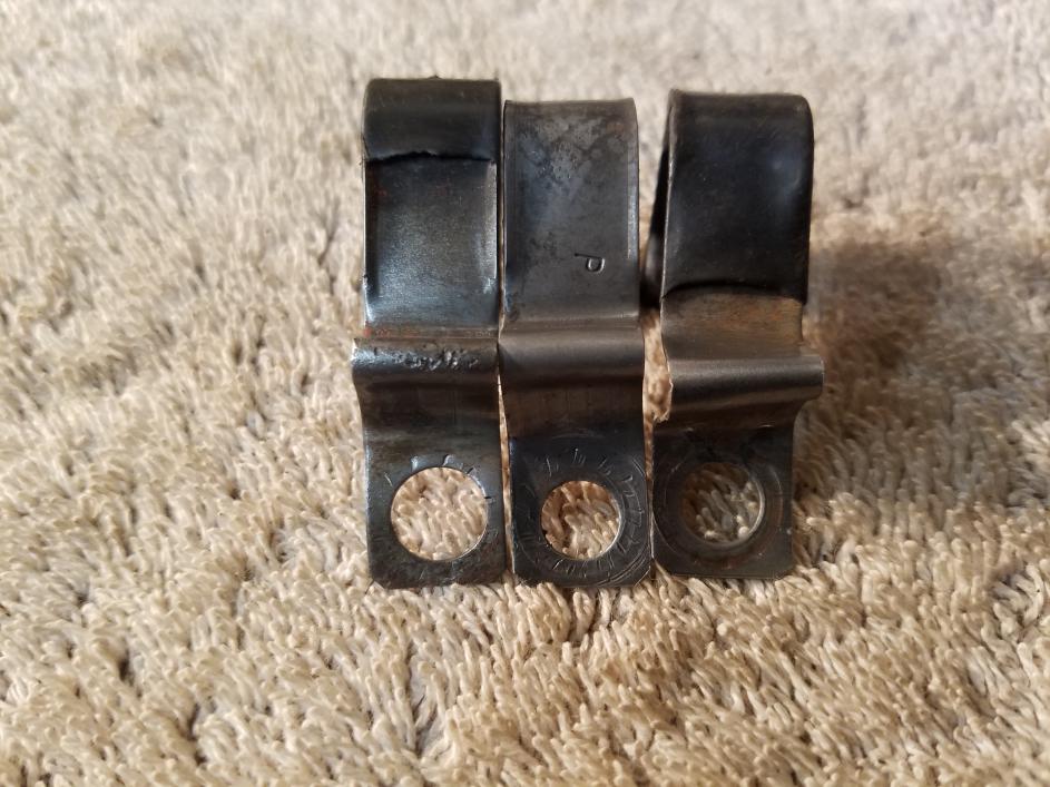 I have several sets of original big and small block battery cable to oil Pan mounting clips the small block clips are sized for a quarter inch bolt to go through the big block clips are sized for a 5/16 bolt to go through. They all have p stamps on them some of them have original Vulcanizing some of them need to be redone. Let me know if you're looking for Survivor or restored. Small block sets are 30 a pair big block sets are 50 of pair. All prices ship to the lower 48