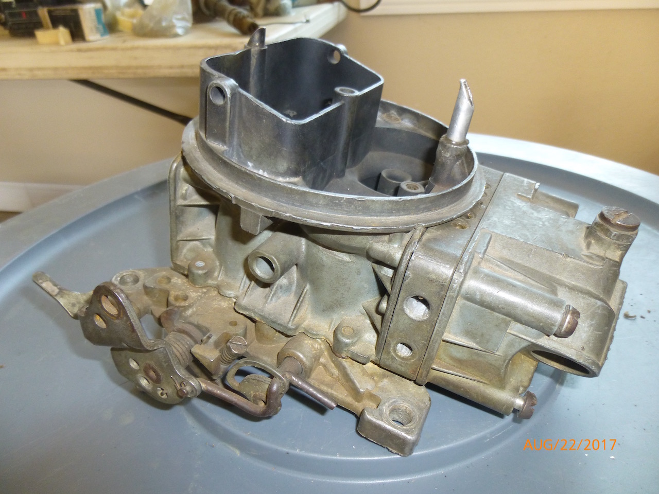 Incomplete 4801 Holley carb. Missing one metering block and bowl and the choke stuff. Has the correct 4519 metering block. The rear air horn tube has been repaired at some point. There is a small ding in the air horn above the part numbers. Dated 094 (4th week of Sept, 1970). Linkage works freely.