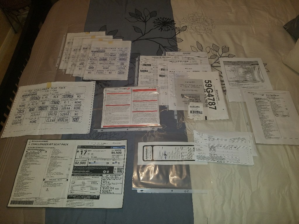 Selling my 2016 Scat Pack Challenger. I'm just not driving it that much, but man, this thing will haul and is a blast to drive! 6400 miles. 6.4L 485hp, 6spd manual, B5 Blue, Black Suede/Napa Leather with R/T logo, Sunroof, Nav, Heated/Vented Seats, heated steering wheel, Driver Convenienice Group, Leather interior group, U-Connect Nav 8.4, 20x9 Hyper Black wheels. The cool thing about the car is all the paperwork: 5 Broadcast sheets including the large, final one...Monroney Label, Sunvisor Sleeve/Airbag/Starting instructions, 2 Shipping/Delievery sheets, Dash assembly sheet, Trunk equipment sheet, and I even have the "Welcome and Thanks!" booklet they mailed to me after the purchase with the Dodge leather keychain enclosed inside. A guy over on the Challenger forum who works at Chrysler ran my car's VIN and it seems it's 1 of 1. I have the report to show this. Does all this mean anything? Not really. It's not a 1970 Hemi Cuda....but us being the kind of guys we are about these cars, it's neat to have the paperwork. Oh, and after the first oil change I kept the "Assembly line" oil filter too! 3 oil changes so far (one about every 6 months) so it'll come to you with a fresh oil change. I did add three things that are tasteful (in my mind, anyway). I put a Pentastar on the passenger fender, a pair of 70 Scatpack Bees in the quarter windows, and added a FACTORY SCAT PACK BEE logo from a Charger to the rear spoiler. Underside and engine... even the wheel well liners look new! Other than those little mods, it is completely stock. Just about as new as you can get! Bought a Viper and don't need this car and want it to go to someone who'll enjoy it. Figured I'd try it here to see if anyone had any interest. $33,000. Yep, I know it's a little low, but looking for a quick sale. Thanks guys.... and yes...I found another car I want to buy!