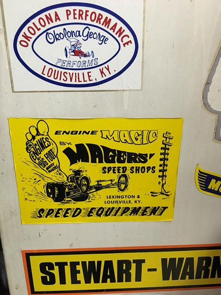 Thanks to Facebook and reader Rodman Phillips I was able to determine what this decal was that I found on the cowl end. Turns out to be a speed shop from Louisville. Really cool to see what it looked like originally and that it was a local speed shop. Now all I have to do is find one or have this one reproduced.