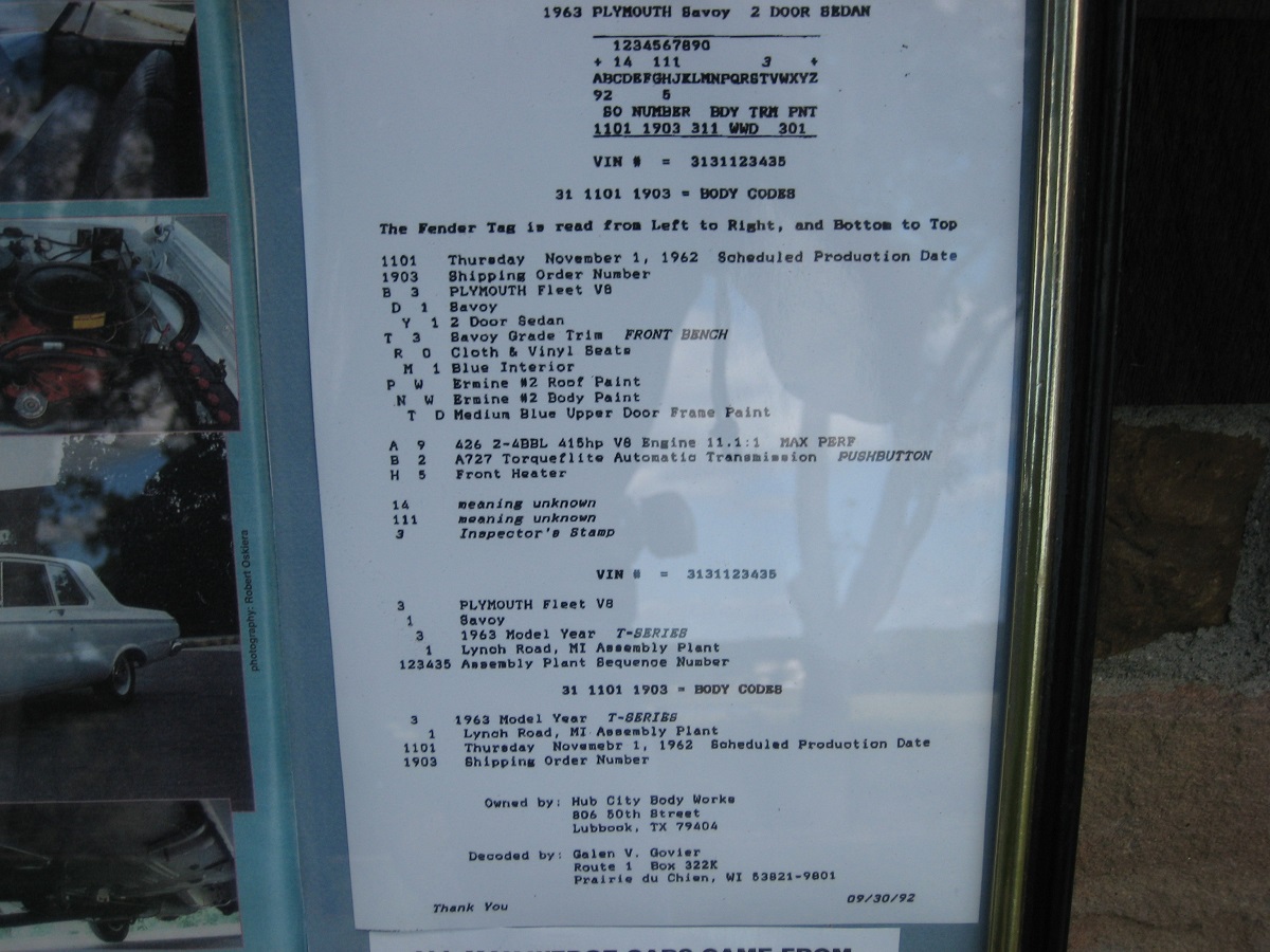 Hi Dave, I hope that all is well with you. Since you burst my bubble back in July regarding the authenticity of my 1963 Plymouth Savoy I have spent untold hours researching the Max Wedge cars to see if mine is real or fake. I had many sleepless nights and thought that I had a clone or fake on my hands. I can now report back to you that 63 Max-Wedge is 100% real with all documentation and “MATCHING” VIN and SO numbers. I first wrote to Chrysler Historical to obtain a copy of the car’s original “Car Record Card” (IBM Card) (copy attached). This is the most important piece of documentation that an owner (or buyer) can have in order to confirm the authenticity of a Max Wedge car. The IBM card contains the Shipping Order (SO) number and the VIN number. According to the attached article from Maxwedge.com “the SO is the number that ties in with the VIN of the car and proves the body matches the VIN. It really is a safeguard for protecting a car from being counterfeited.” I have also attached a copy of the original “Build Sheet” for this vehicle. The shipping order number on the build sheet, taken from the car, matches the SO number. There is no doubt that this max wedge car has its original body and Sheetmetal and that the VIN number on the car is the correct matching VIN number for the car. I have attached photographs of the SO number stamped into the front radiator support as well as the SO numbers stamped into the rear package tray, in front of the rear window. I removed the rear seat, cardboard backing, tray cardboard and finished panel in order to take photographs of the SO number (photo’s attached). I will leave the rear seat assembled so that you may come to my shop to verify these numbers. If I don’t hear back within a week that you would like to document the SO numbers on the car then I will put it all back together. With all of the SO numbers and VIN number matching then that leaves us with the reproduction or replacement VIN tag. I can only speculate as to what occurred whereas I was not the owner or present when the restoration took place.. When this car was nut and bolt restored in the late 80’s or early nineties I don’t believe that much attention was paid to the authenticity of VIN tags. I believe that the VIN tag was most likely removed for the restoration and then crudely reattached after painting. Although someone has questioned the crudely attached VIN as being authentic because of the small font, raised numeral stamping, I have attached a copy of another small font, stamped VIN from a “REAL” Max Wedge 1963 Plymouth Savoy (built 12/62). Although the VIN has been removed from the car (during a restoration) it is the real original VIN. So it is evident that the early 63 Savoy’s (mine was built 11/62) had this type of VIN tag. I will really need to look at some other documented early 63 Savoy’s to see if their tags appear differently. Although you sent me photographs of two additional MOPAR VIN’s, which appear at the end of this e-mail chain, neither is a VIN off of an early production 1963 Savoy Max Wedge Car. One is from a 1964 Plymouth Savoy (3141) and the other is from a 1962 Plymouth Savoy Suburban (2521) six cylinder car. The “pre-punched” type of VIN tag may well have been only for the standard Savoy’s (punched 31 indicates Savoy) and the special production Max Wedge cars received the “stamped” type. Regardless of what was used back in the day this 63 Max Wedge is a real Max Wedge with all matching body numbers. I spoke with Darrell Davis and sent him the photographs of the two types of VIN tags regarding this discrepancy and he informed me that “maybe that they used some tags with single debossed numbers. I can’t explain it.” I have this e-mail response in my files. Darrell did state in his reply that “if the body number (stamped) on the car is correct with the SO Number then the car is that VIN so I can’t describe what happened.” In other words If the SO numbers match the VIN numbers then the car is the real deal. Obviously I should have left the crudely welded VIN tag on the car and left it at that. Because I like clean looking details I obtained a reproduction Vin (for which I have documentation) and ground off the existing VIN. I was unaware that the tag should have been spot welded so I just welded it on. Then your guy brought up the fact that the VIN did not look correct and was attached incorrectly. He was correct on the attachment but maybe not on the stamping vs punching of the first two numerals. So anyhow, after months of research and reading I am completely satisfied that the car is a real deal 20,000 mile Max Wedge car with all required documentation to back it up. It has also been decoded by Galen Govier. I am sure that when Galen verified the car in 1992 that he looked at the stamped SO body numbers an also saw the VIN that was attached (reattached) to the car at that time. This car is also listed in the Darrell Davis book of 1963 Max Wedge cars. I currently have the car consigned to the MECUM January 2018 Kissimmee FL auction. I cannot remove the car at this time without paying a substantial penalty. Should you have any interested buyers they may see it at this auction. If it does not meet its reserve price then I will bring it back and you may market it accordingly now that we both know that it is a “REAL” Max Wedge car. I am grateful for having the discrepancies on the VIN pointed out to me. That caused me to do much research and verification. I can now market the car knowing that it is not a clone or fake. Please let me know if you have any questions or would like to verify the stamped body SO numbers before I put it back together in case you need to verify them for a future customer. Regards, Steve The WEBSITE used as a reference for this is >> http://racehemi.maxwedge.com/topics/real.php I hope this helps clear things up - thanks guys and MERRY CHRISTMAS!!