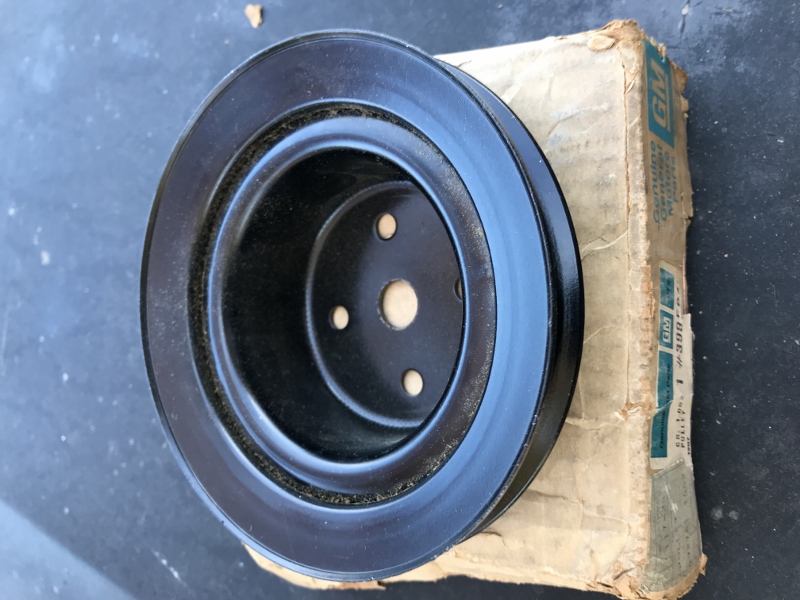 Hi Everyone, as shown, I have a real, old NOS replacement deep groove water pump pulley. part number 3995647 that superseded the assembly line stamped part numbers and came on later HiPo cars I believe.