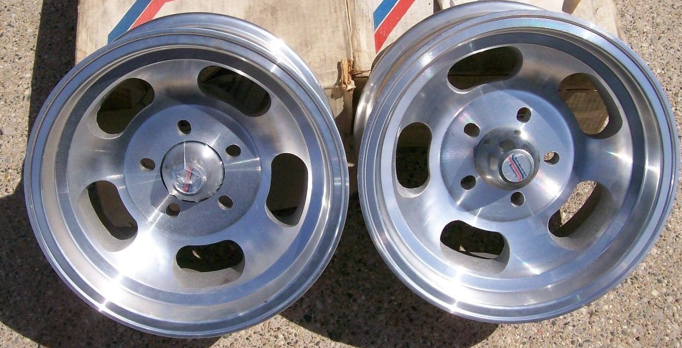 2 nos 14x7 American racing and 2 used but mint 15x8.5 American Racing "Spirit" slot mags. 4.5/4.75 unilug. 2 nos caps and 2 that are near NOS. 14 x7 are in factory boxes with instructions on torque specs etc. I peeled off the hoaky camaro stickon emblems off the used capos to find perfect American Racing decals underneath
