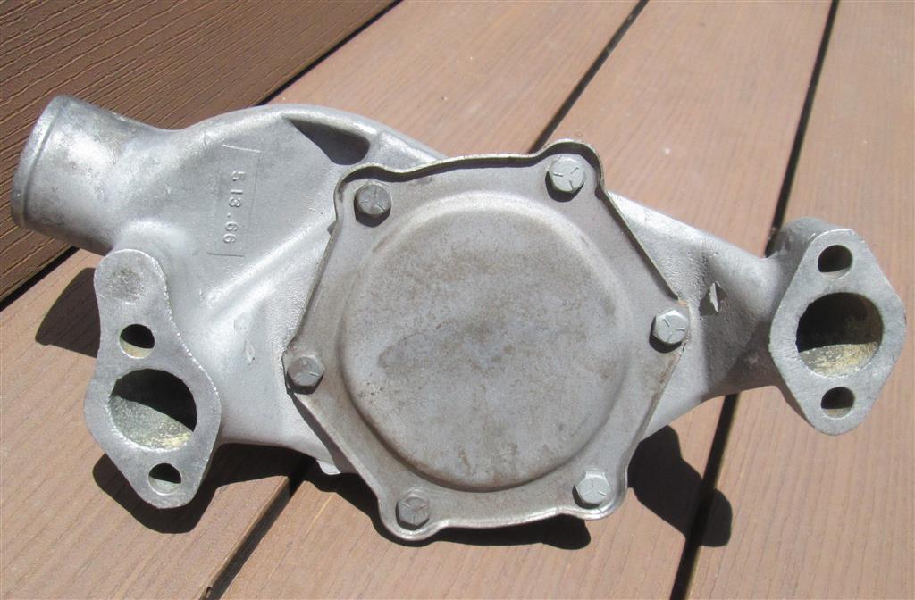 This is an original GM aluminum water pump for Small Block Chevy engines. The casting number is 3824059. The casting date is 5/13/66 as shown.