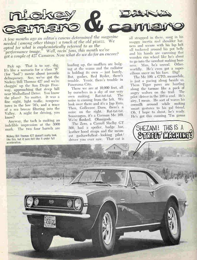 I've heard Bill Thomas was the first person to do development of a big block in a Camaro as early as August '66 but whether that was contract work for Chevrolet or for the Nickey/Thomas partnership is unknown. |