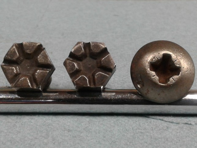 This set of shifter mounting hardware has the original large head phillips screw with a cross-hatch pattern, a TR head marking bolt, castle head bolts and an M head marking bolt which was replated. The others are original finish. $60. PP FF