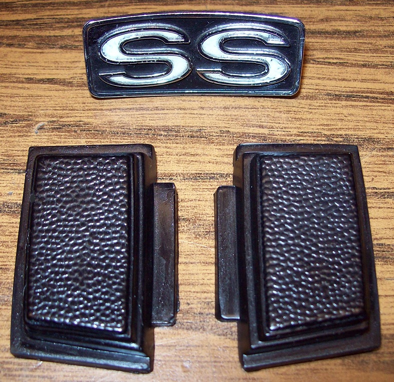 Real GM 1969 Standard Steering Wheel Horn Shroud Buttons (Pebble Grain) and SS Emblem with nuts.