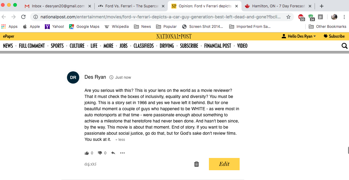 Went and saw this last weekend. Really enjoyed it and learned some new things (though in usual hollywood fashion I am sure some were embellished). To me it was a good story of a bygone era. My favorite quote - "that's why your Henry Ford the second" ![]() Of course, the pundits are blasting the movie as too white, too male and too straight. https://nationalpost.com/entertainme...Lm1J7zOu7MFBLg Quote: