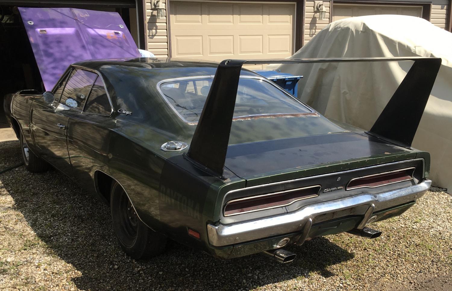 As we chatted about old cars he told me he had a Daytona in his garage . I said 'what kind of Daytona' and he said 'a 1969' and I said 'you mean a wing car? ' and he said ''yes' .... I asked to see it and he was really skiddish and wouldn't show it to me ...... As time passed he finally showed it to me but wouldn't let me take pictures to show to a friend of mine . FINALLY he had it out in the driveway today !!!! AND I got the pics and have already looked it up on a Datona registry I found online and its an unknown car never documented on the registry I found , delivery #500 in production and VIN was all they knew ... He told me he bought it brand new in 1970 at the local dodge dealer Goeke Dodge Chrysler Plymouth in Noblesville IN for around $4000 ! Its a 440 car 4 speed dark green . All original car with 28,000 original but it does have some rust BUT is overall decent condition with original paint , front fenders are rusty , car is nice and straight down the sides ...... Here's some pics I captured today !!!! Last edited by DR1966; 04-25-2020 at 03:32 AM. |