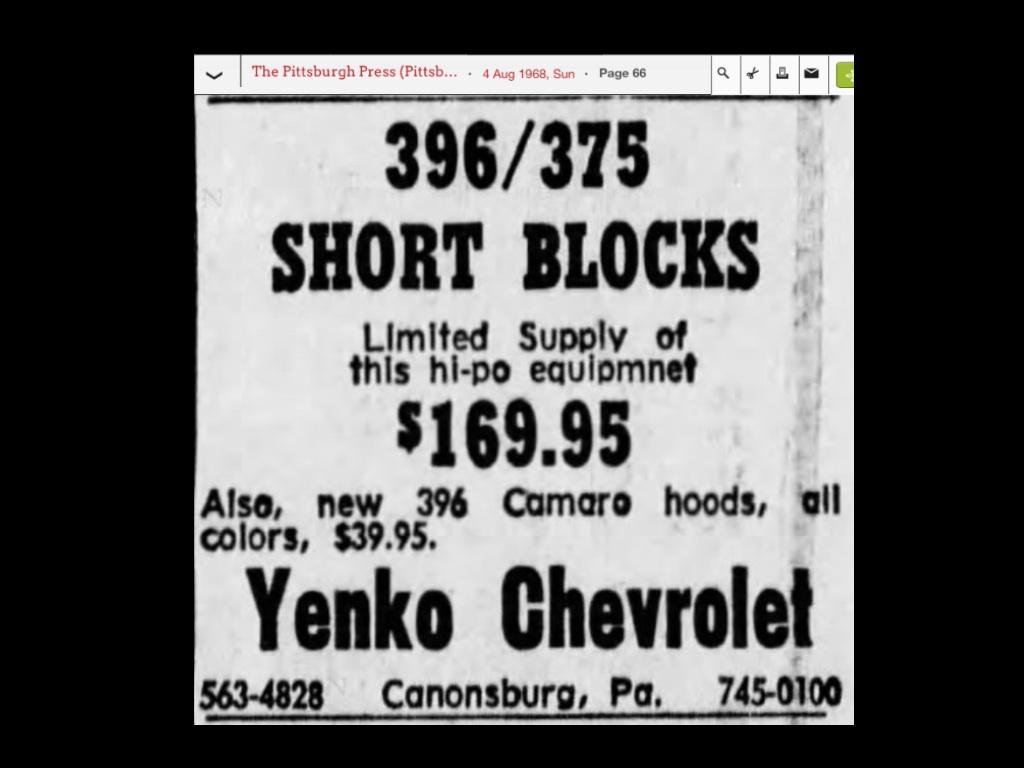 I was in college in Pittsburgh in the late 60's, and there was always an ad in the Sunday Pittsburgh Press, with engines, short blocks and wheels/tires for sale. (maybe other stuff aswell, I don't remember) In the pre-COPO period, Yenko was trying to recoup as much of the conversion costs as he coulld, as quickly as he could.